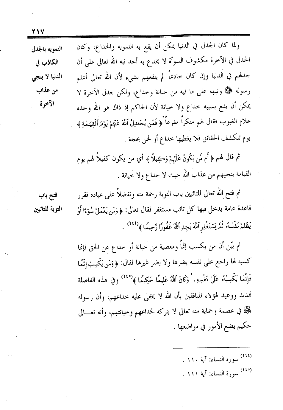 ثم بيّن أن من يكسب إثماً ومعصية من خيانة أو خداع عن الحق فإنما كسبه لها راجع علي نفسه يضرها ولا يضر غيرها فقال: (وَمَنْ يَكْسِبْ إِثْمًا فَإِنَّمَا يَكْسِبُهُ عَلَى نَفْسِهِ وَكَانَ اللهُ عَلِيمًا حَكِيمًا (111)) وفي هذه الفاصلة تهديد ووعيد لهؤلاء المنافقين بأن الله لا يخفى عليه خداعهم، وأن رسوله - صلى الله عليه وسلم - في عصمة وحماية منه تعالى لا يتركه لخداعهم وخيانتهم، وأنه تعالى حكيم يضع الأمور في مواضعها.