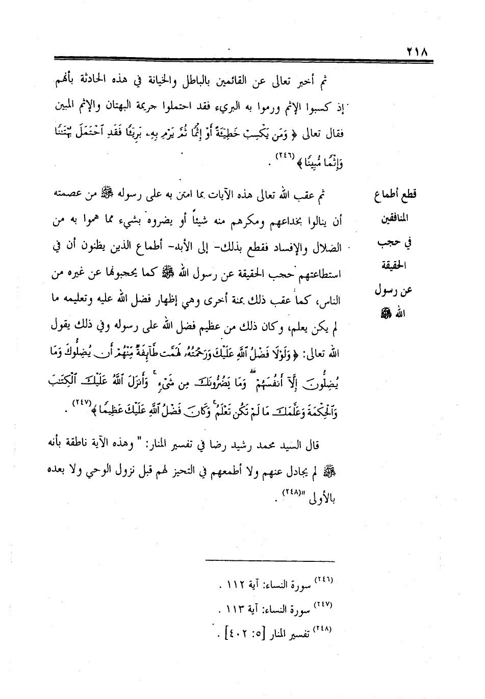 ثم عقب الله تعالى هذه الآيات بما امتن به على رسوله - صلى الله عليه وسلم - من عصمته أن ينالوا بخداعهم ومكرهم منه شيئاً أو يضروه بشيء مما هموا به من الضلال والإفساد فقطع بذلك -إلى الأبد- أطماع الذين يظنون أن في استطاعتهم حجب الحقيقة عن رسول الله - صلى الله عليه وسلم - كما يحجبونها عن غيره من الناس، كما عقب ذلك بمنة أخرى وهي إظهار فضل الله عليه وتعليمه ما لم يكن يعلم، وكان ذلك من عظيم فضل الله على رسوله وفي ذلك يقول الله تعالى: (وَلَوْلَا فَضْلُ اللهِ عَلَيْكَ وَرَحْمَتُهُ لَهَمَّتْ طَائِفَةٌ مِنْهُمْ أَنْ يُضِلُّوكَ وَمَا يُضِلُّونَ إِلَّا أَنْفُسَهُمْ وَمَا يَضُرُّونَكَ مِنْ شَيْءٍ وَأَنْزَلَ اللهُ عَلَيْكَ الْكِتَابَ وَالْحِكْمَةَ وَعَلَّمَكَ مَا لَمْ تَكُنْ تَعْلَمُ وَكَانَ فَضْلُ اللهِ عَلَيْكَ عَظِيمًا (113)).