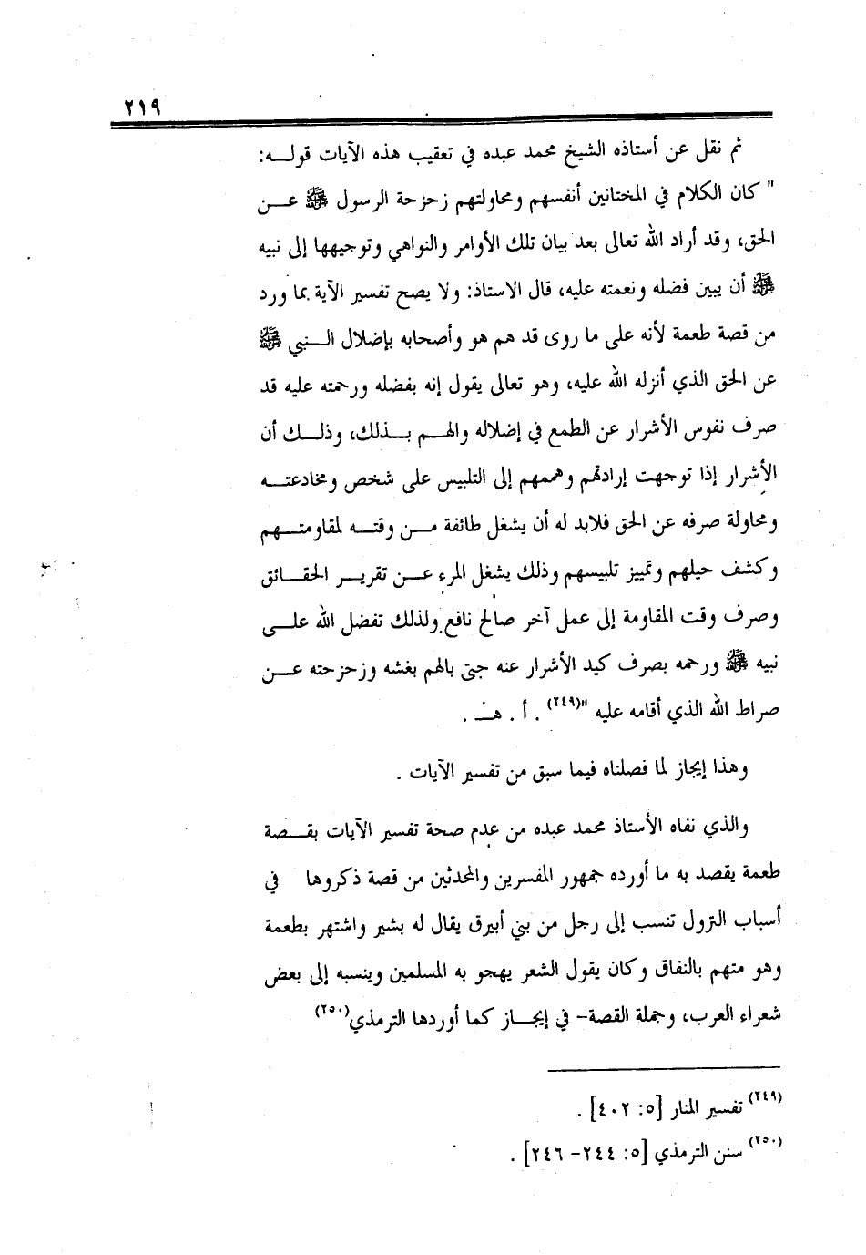 ثم نقل عن أستاذه الشيخ محمد عبده في تعقيب هذه الآيات قوله: " كان الكلام في المختانين أنفسهم ومحاولتهم زحزحة الرسول - صلى الله عليه وسلم - عن الحق، وقد أراد الله تعالى بعد بيان تلك الأوامر والنواهي وتوجيهها إلى نبيه - صلى الله عليه وسلم - أن يبين فضله ونعمته عليه، قال الأستاذ: ولا يصح تفسير الآية بما ورد من قصة طعمة لأنه على ما روي قد هم هو وأصحابه بإضلال النبي - صلى الله عليه وسلم - عن الحق الذي أنزله الله عليه، وهو تعالى يقول إنه بفضله ورحمته عليه قد صرف نفوس الأشرار عن الطمع في إضلاله والهم بذلك، وذلك أن الأشرار إذا توجهت إرادتهم وهممهم إلى التلبيس على شخص ومخادعته ومحاولة صرفه عن الحق فلابد له أن يشغل طائفة من وقته لمقاومتهم وكشف حيلهم وتمييز تلبيسهم وذلك يشغل المرء عن تقرير الحقائق وصرف وقت المقاومة إلى عمل آخر صالح نافع ولذلك تفضل الله على نبيه - صلى الله عليه وسلم - ورحمه بصرف كيد الأشرار عنه حتى بِالهمِّ بغشه وزحزحته عن صراط الله الذي أقامه عليه ". أ. هـ.