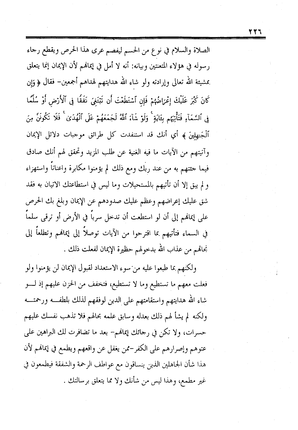 الصلاة والسلام في نوع من الحسم ليفصم عرى هذا الحرص ويقطع رجاء رسوله في هؤلاء المتعنتين وبيانه: أنه لا أمل في إيمانهم لأن الإيمان إنما يتعلق بمشيئة الله تعالى وإرادته ولو شاء الله هدايتهم لهداهم أجمعين - فقال (وَإِنْ كَانَ كَبُرَ عَلَيْكَ إِعْرَاضُهُمْ فَإِنِ اسْتَطَعْتَ أَنْ تَبْتَغِيَ نَفَقًا فِي الْأَرْضِ أَوْ سُلَّمًا فِي السَّمَاءِ فَتَأْتِيَهُمْ بِآيَةٍ وَلَوْ شَاءَ اللهُ لَجَمَعَهُمْ عَلَى الْهُدَى فَلَا تَكُونَنَّ مِنَ الْجَاهِلِينَ (35)). أي أنك قد استنفدت كل طرائق موجبات دلائل الإيمان وآتيتهم من الآيات ما فية الغنية عن طلب المزيد وتحقق لهم أنك صادق فيما جئتهم به من عند ربك ومع ذلك لم يؤمنوا مكابرة وإعناتاً واستهزاء ولم يبق إلا أن تأتيهم بالمستحيلات وما ليس فِي استطاعتك الإتيان به فقد شق عليك إعراضهم وعظم عليك صدودهم عن الإيمان وبلغ بك الحرص على إيمانهم إلى أن لو استطعت أن تدخل سرباً في الأرض أو ترقى سلماً في السماء فتأتيهم بما اقترحوا من الآيات توصلاً إلى إيمانهم وتطلعاً إلى نجاتهم من عذاب الله بدخولهم حظيرة الإيمان لفعلت ذلك.