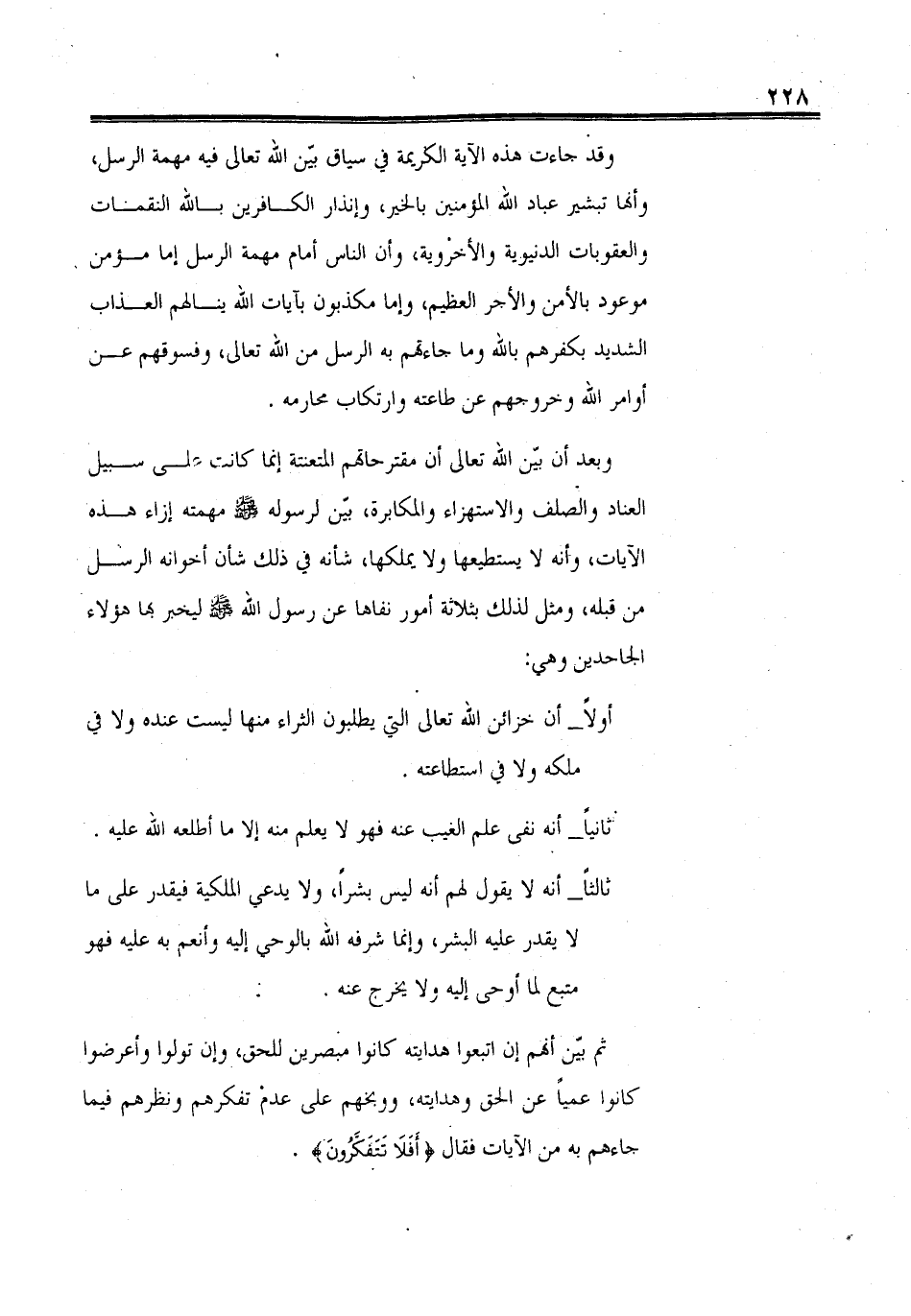 ثالثاً - أنه لا يقول لهم إنه ليس بشراً، ولا يدعي الملكية فيقدر على ما لا يقدر عليه البشر، وإنما شرفه الله بالوحي إليه وأنعم به عليه فهو متبع لما أوحي إليه ولا يخرج عنه.