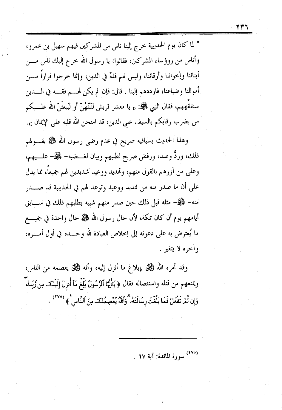وقد أمره الله - عز وجل - بإبلاغ ما أنزل إليه، وأنه - عز وجل - يعصمه من الناس، ويمنعهم من قتله واستئصاله فقال (يَا أَيُّهَا الرَّسُولُ بَلِّغْ مَا أُنْزِلَ إِلَيْكَ مِنْ رَبِّكَ وَإِنْ لَمْ تَفْعَلْ فَمَا بَلَّغْتَ رِسَالَتَهُ وَاللهُ يَعْصِمُكَ مِنَ النَّاسِ).