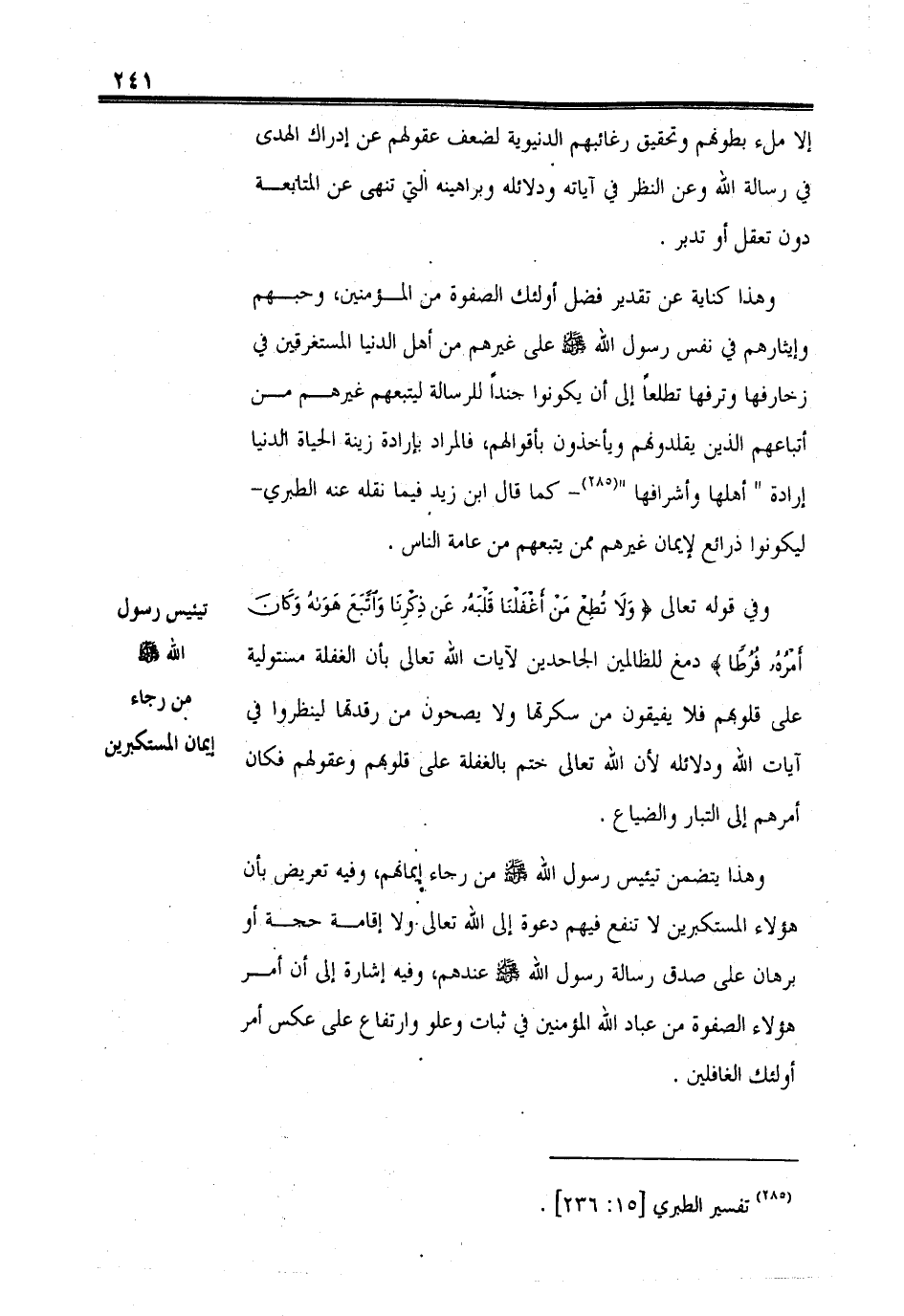 وهذا يتضمن تيئيس رسول الله - صلى الله عليه وسلم - من رجاء إيمانهم، وفيه تعريض بأن هؤلاء المستكبرين لا تنفع فيهم دعوة إلى الله تعالى ولا إقامة حجة أو برهان على صدق رسالة رسول الله - صلى الله عليه وسلم - عندهم، وفيه إشارة إلى أن أمر هؤلاء الصفوة من عباد الله المؤمنين في ثبات وعلو وارتفاع على عكس أمر أولئك الغافلين.