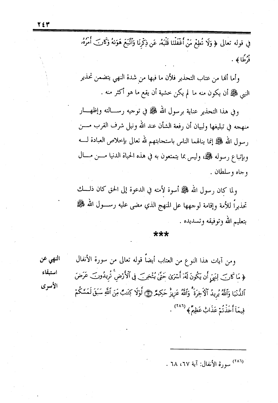 ولما كان رسول الله من أسوة لأمته في الدعوة إلى الحق كان ذلك تحذيراً للأمة وإقامة لوجهها على المنهج الذي مضى عليه رسول الله - صلى الله عليه وسلم - بتعليم الله وتوفيقه وتسديده.
