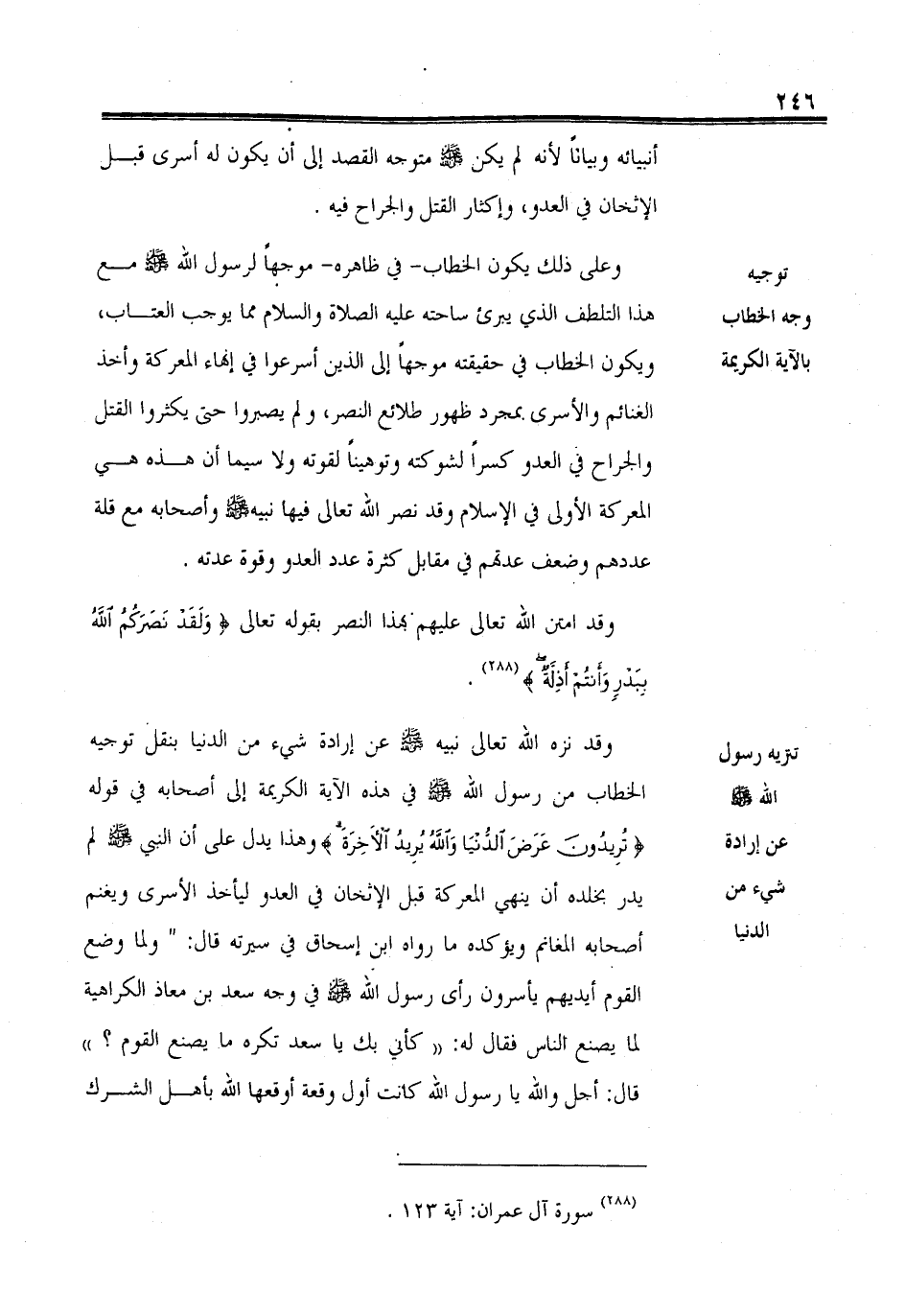 وقد نزه الله تعالى نبيه - صلى الله عليه وسلم - عن إرادة شيء من الدنيا بنقل توجيه الخطاب من رسول الله - صلى الله عليه وسلم - في هذه الآية الكريمة إلى أصحابه في قوله (تُرِيدُونَ عَرَضَ الدُّنْيَا وَاللهُ يُرِيدُ الْآخِرَةَ) وهذا يدل على أن النبي - صلى الله عليه وسلم - لم يدر بخلده أن ينهي المعركة قبل الإثخان في العدو ليأخذ الأسرى ويغنم أصحابه المغانم ويؤكده ما رواه ابن إسحاق في سيرته قال: " ولما وضع القوم أيديهم يأسرون رأى رسول الله - صلى الله عليه وسلم - في وجه سعد بن معاذ الكراهية لما يصنع الناس فقال له: " كأني بك يا سعد تكره ما يصنع القوم؟ " قال: أجل والله يا رسول الله كانت أول وقعة أوقعها الله بأهل الشرك
