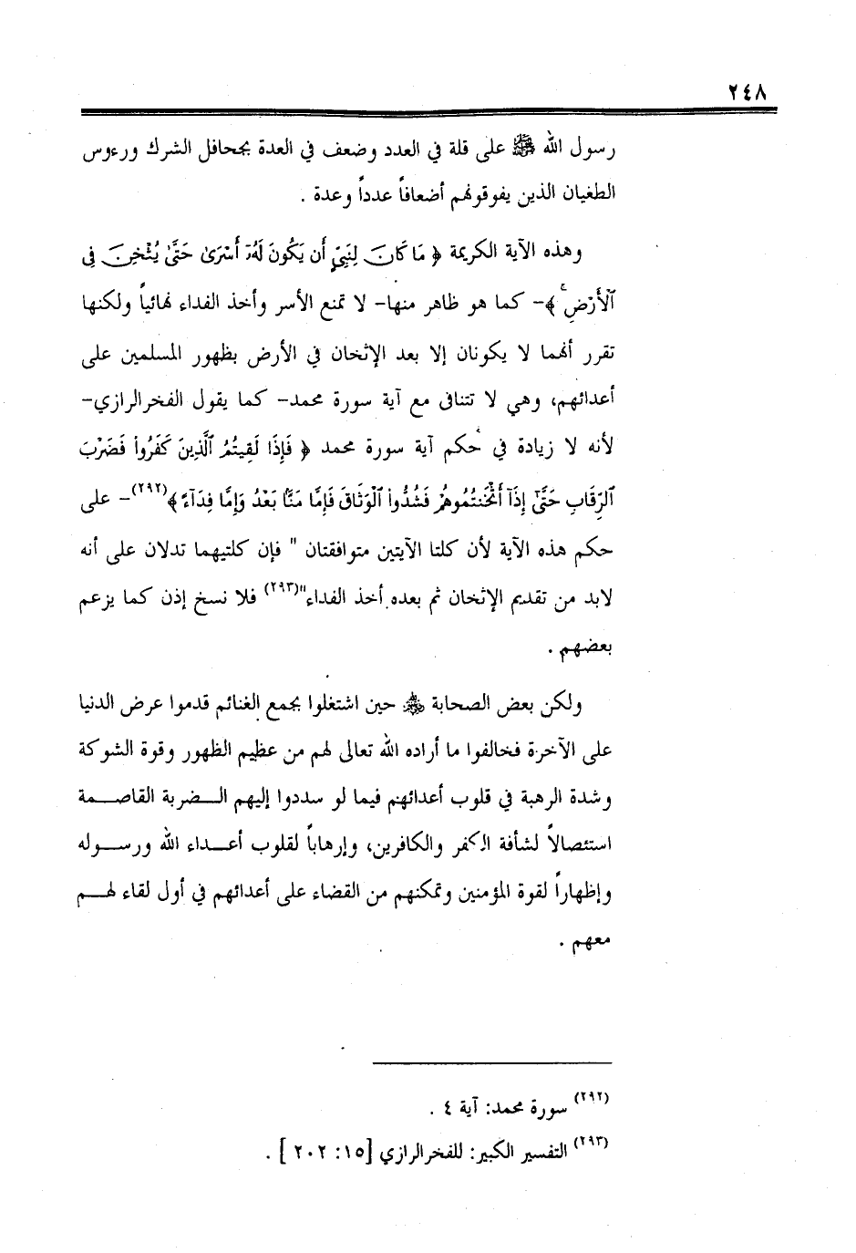 وهذه الآية الكريمة (مَا كَانَ لِنَبِيٍّ أَنْ يَكُونَ لَهُ أَسْرَى حَتَّى يُثْخِنَ فِي الْأَرْضِ) -كما هو ظاهر منها- لا تمنع الأسر وأخذ الفداء نهائياً ولكنها تقرر أنهما لا يكونان إلا بعد الإثخان في الأرض بظهور المسلمين على أعدائهم، وهى لا تتنافى مع آية سورة محمد -كما يقول الفخر الرازي- لأنه لا زيادة في حكم آية سورة محمد (فَإِذَا لَقِيتُمُ الَّذِينَ كَفَرُوا فَضَرْبَ الرِّقَابِ حَتَّى إِذَا أَثْخَنْتُمُوهُمْ فَشُدُّوا الْوَثَاقَ فَإِمَّا مَنًّا بَعْدُ وَإِمَّا فِدَاءً) - على حكم هذه الآية لأن كلتا الآيتين متوافقتان " فإن كلتيهما تدلان على أنه لابد من تقديم الإثخان ثم بعد أخذ الفداء فلا نسخ إذن كما يزعم بعضهم.