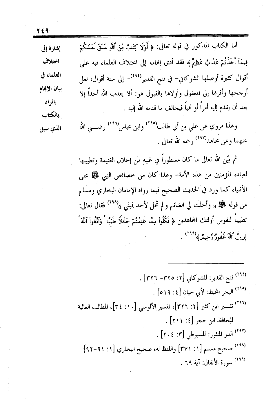 أما الكتاب المذكور في قوله تعالى: (لَوْلَا كِتَابٌ مِنَ اللهِ سَبَقَ لَمَسَّكُمْ فِيمَا أَخَذْتُمْ عَذَابٌ عَظِيمٌ) فقد أدى إبهامه إلى اختلاف العلماء فيه على أقوال كثيرة أوصلها الشوكاني -في فتح القدير- إلى ستة أقوال، لعل أرجحها وأقربها إلى العقول وأولاها بالقبول هو: ألا يعذب الله أحداً إلا بعد أن يقدم إليه أمراً أو نهياً فيخالف ما قدمه الله إليه.