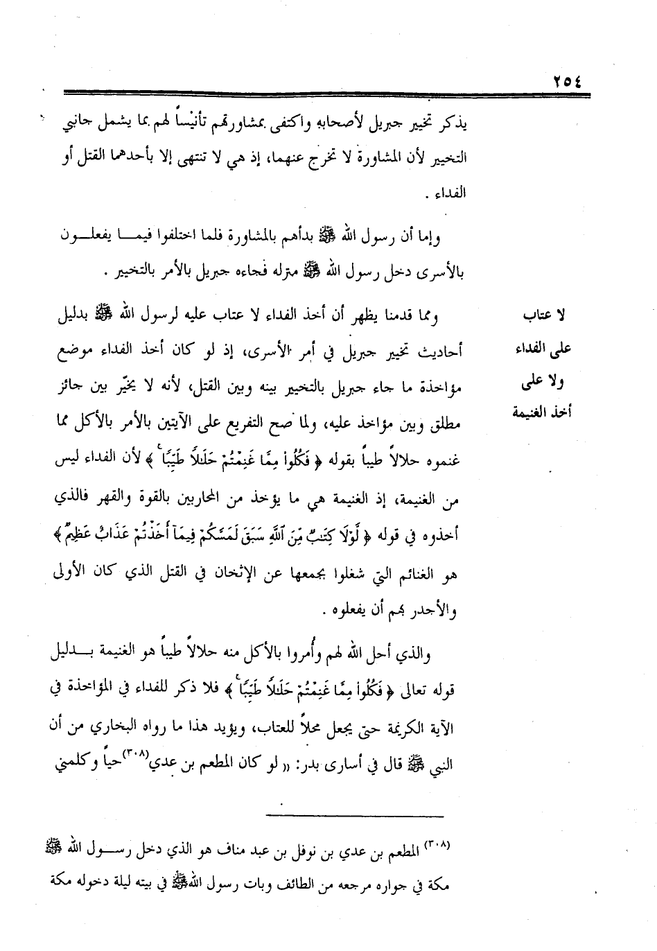 ومما قدمنا يظهر أن أخذ الفداء لا عتاب عليه لرسول الله - صلى الله عليه وسلم - بدليل أحاديث تخيير جبريل في أمر الأسرى، إذ لو كان أخذ الفداء موضع مؤاخذة ما جاء جبريل بالتخيير بينه وبين القتل، لأنه لا يخيّر بين جائز مطلق وبين مؤاخذ عليه، ولما صح التفريع على الآيتين بالأمر بالأكل مما غنموه حلالاً طيباً بقوله (فَكُلُوا مِمَّا غَنِمْتُمْ حَلَالًا طَيِّبًا) لأن الفداء ليس من الغنيمة، إذ الغنيمة هى ما يؤخذ من المحاربين بالقوة والقهر فالذي أخذوه في قوله (لَوْلَا كِتَابٌ مِنَ اللهِ سَبَقَ لَمَسَّكُمْ فِيمَا أَخَذْتُمْ عَذَابٌ عَظِيمٌ (68)).