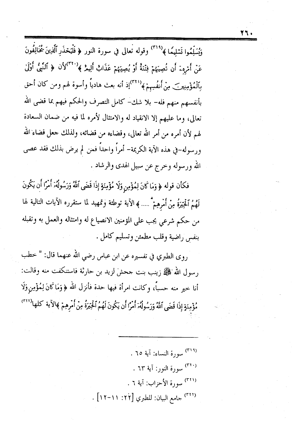 وقوله تعالى في سورة النور (فَلْيَحْذَرِ الَّذِينَ يُخَالِفُونَ عَنْ أَمْرِهِ أَنْ تُصِيبَهُمْ فِتْنَةٌ أَوْ يُصِيبَهُمْ عَذَابٌ أَلِيمٌ) لأن (النَّبِيُّ أَوْلَى بِالْمُؤْمِنِينَ مِنْ أَنْفُسِهِمْ) إذ أنه بعث هادياً وأسوة لهم ومن كان أحق بأنفسهم منهم فله -بلا شك- كامل التصرف والحكم فيهم بما قضى الله تعالى، وما عليهم إلا الانقياد له والامتثال لأمره لما فيه من ضمان السعادة لهم لأن أمره من أمر الله تعالى، وقضاءه من قضائه، ولذلك جعل قضاء الله ورسوله -في هذه الآية الكريمة- أمراً واحداً فمن لم يرض بذلك فقد عصى الله ورسوله وخرج عن سبيل الهدى والرشاد.