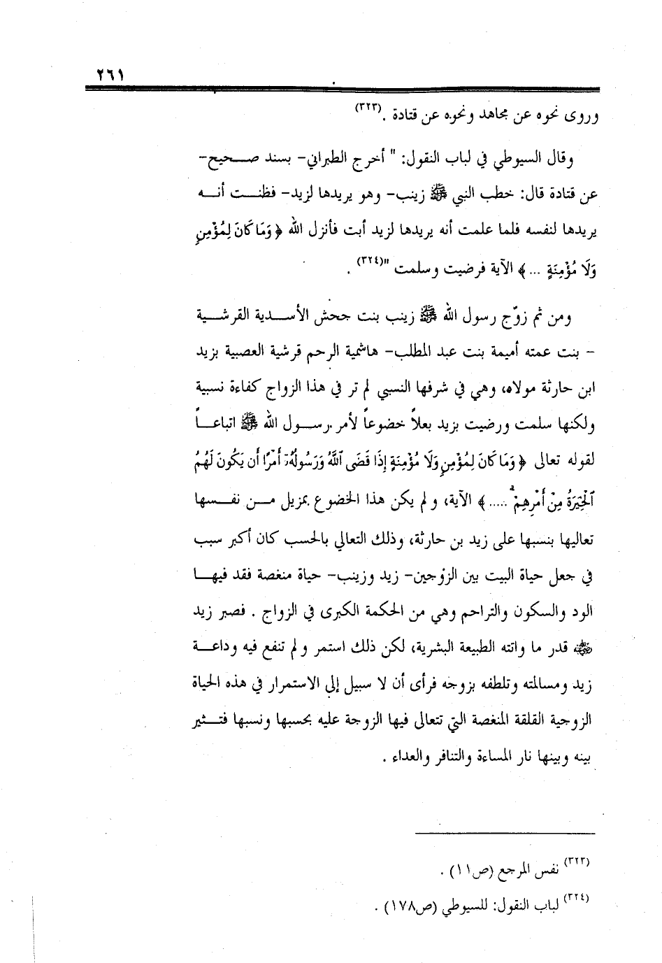 وقال السيوطي في لباب النقول: " أخرج الطبراني -بسند صحيح- عن قتادة قال: خطب النبي - صلى الله عليه وسلم - زينب -وهو يريدها لزيد- فظنت أنه يريدها لنفسه فلما علمت أنه يريدها لزيد أبت فأنزل الله (وَمَا كَانَ لِمُؤْمِنٍ وَلَا مُؤْمِنَةٍ. . .) الآية فرضيت وسلمت ".