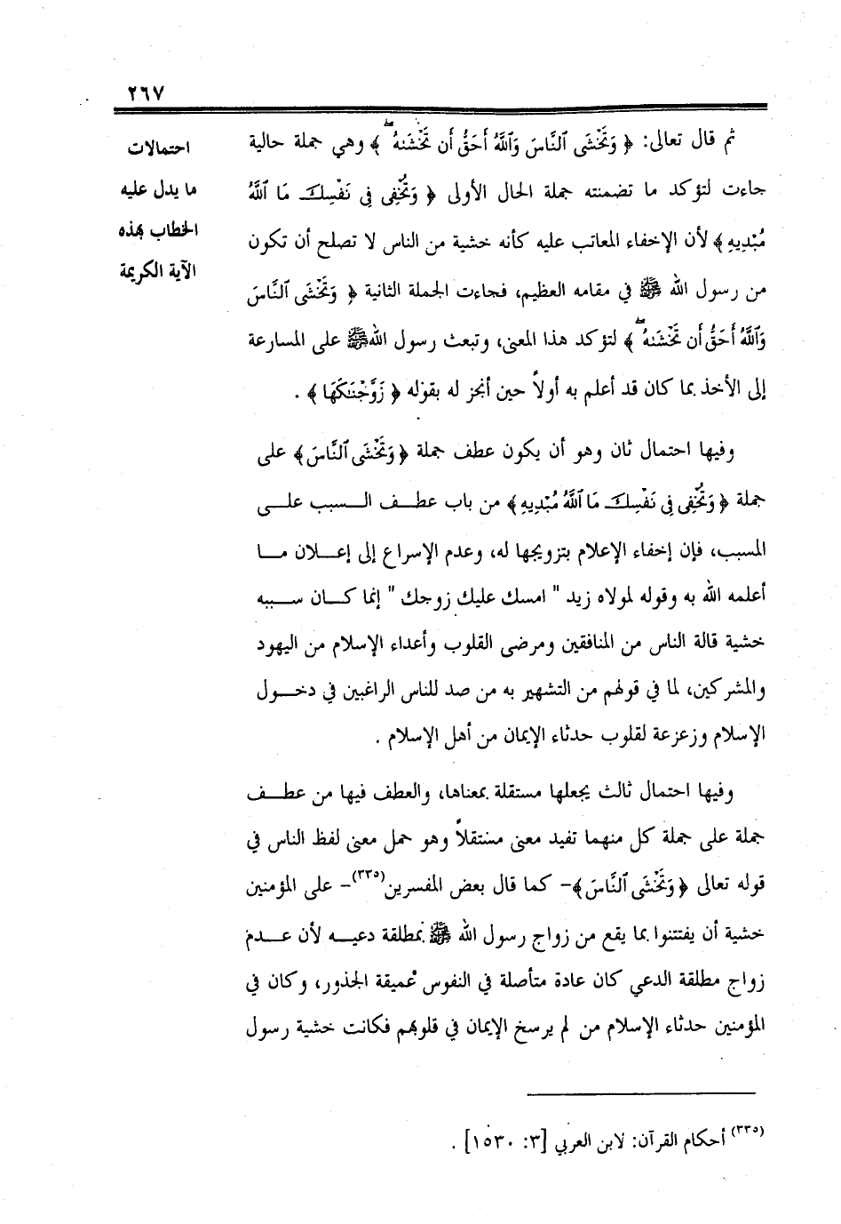 وفيها احتمال ثالث يجعلها مستقلة بمعناها، والعطف فيها من عطف جملة على جملة كل منهما تفيد معنى مستقلاً وهو حمل معنى لفظ الناس في قوله تعالى (وَتَخْشَى النَّاسَ) -كما قال بعض المفسرين- على المؤمنين خشية أن يفتتنوا بما يقع من زواج رسول الله - صلى الله عليه وسلم - بمطلقة دعيه لأن عدم زواج مطلقة الدعي كان عادة متأصلة في النفوس عميقة الجذور، وكان في المؤمنين حدثاء الإسلام من لم يرسخ الإيمان في قلوبهم فكانت خشية رسول الله - صلى الله عليه وسلم -