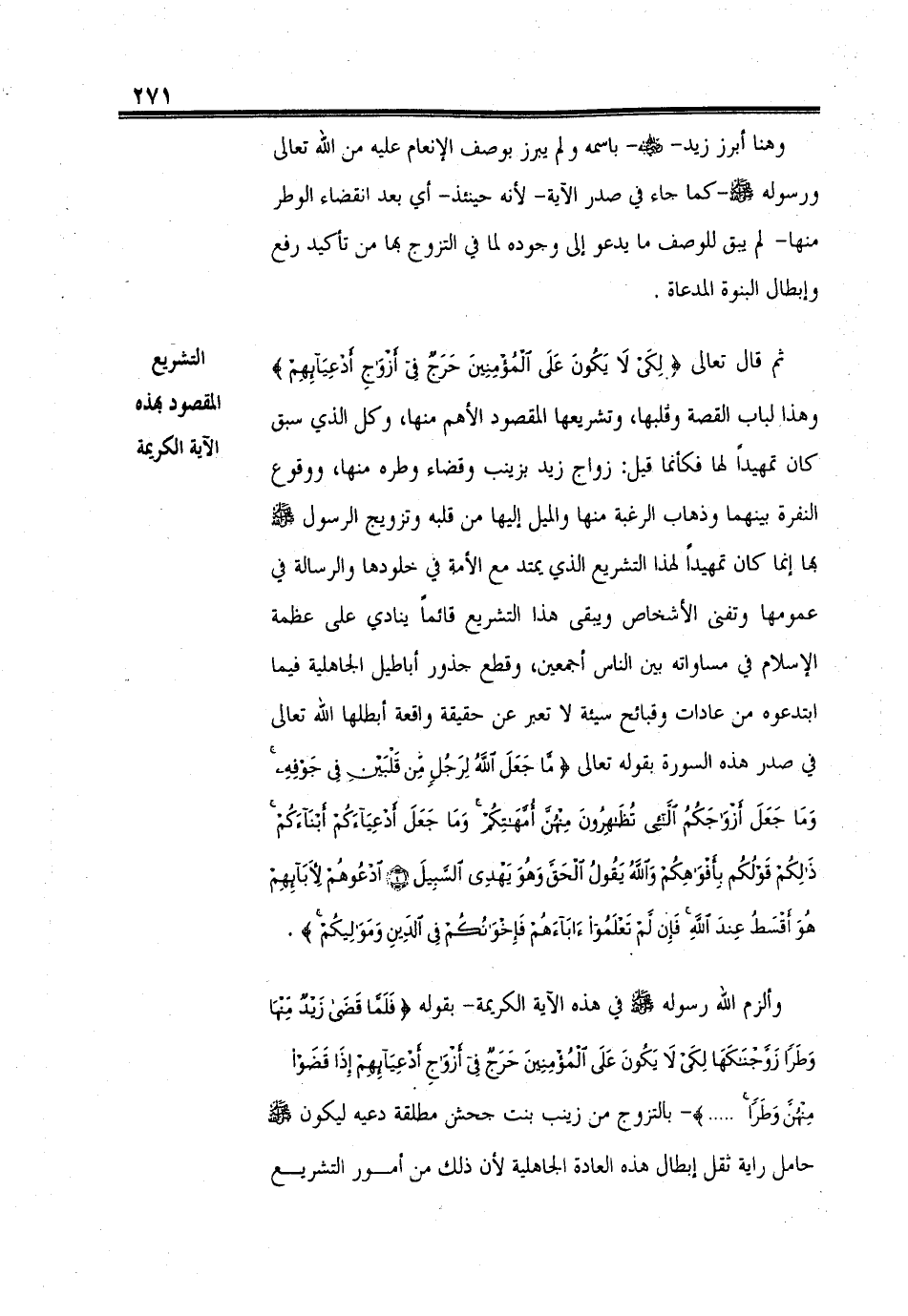 ثم قال تعالى (لِكَيْ لَا يَكُونَ عَلَى الْمُؤْمِنِينَ حَرَجٌ فِي أَزْوَاجِ أَدْعِيَائِهِمْ) وهذا الباب القصة وقلبها، وتشريعها المقصود الأهم منها، وكل الذي سبق كان تمهيداً لها فكأنما قيل: زواج زيد بزينب وقضاء وطره منها، ووقوع النفرة بينهما وذهاب الرغبة منها والميل إليها من قلبه وتزويج الرسول - صلى الله عليه وسلم - بها إنما كان تمهيداً لهذا التشريع الذي يمتد مع الأمة في خلودها والرسالة في عمومها وتفنى الأشخاص ويبقى هذا التشريع قائماً ينادي على عظمة الإسلام في مساواته بين الناس أجمعين، وقطع جذور أباطيل الجاهلية فيما ابتدعوه من عادات وقبائح سيئة لا تعبر عن حقيقة واقعة أبطها الله تعالى في صدر هذه السورة بقوله تعالى (مَا جَعَلَ اللهُ لِرَجُلٍ مِنْ قَلْبَيْنِ فِي جَوْفِهِ وَمَا جَعَلَ أَزْوَاجَكُمُ اللَّائِي تُظَاهِرُونَ مِنْهُنَّ أُمَّهَاتِكُمْ وَمَا جَعَلَ أَدْعِيَاءَكُمْ أَبْنَاءَكُمْ ذَلِكُمْ قَوْلُكُمْ بِأَفْوَاهِكُمْ وَاللهُ يَقُولُ الْحَقَّ وَهُوَ يَهْدِي السَّبِيلَ (4) ادْعُوهُمْ لِآبَائِهِمْ هُوَ أَقْسَطُ عِنْدَ اللهِ فَإِنْ لَمْ تَعْلَمُوا آبَاءَهُمْ فَإِخْوَانُكُمْ فِي الدِّينِ وَمَوَالِيكُمْ).