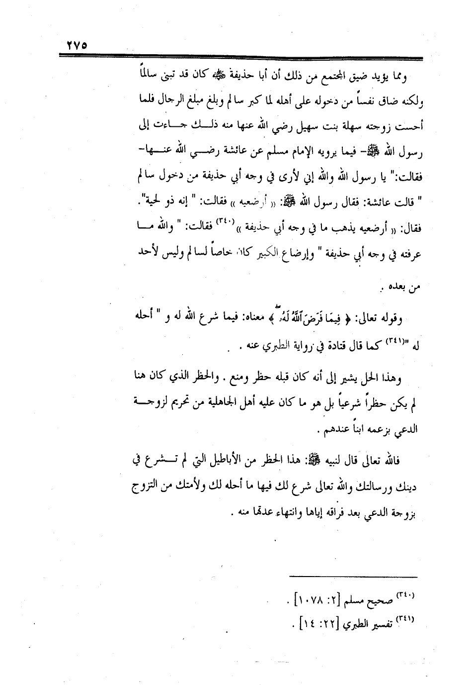 ومما يؤيد ضيق المجتمع من ذلك أن أبا حذيفة - رضي الله عنه - كان قد تبنى سالماً ولكنه ضاق نفساً من دخوله على أهله لما كبر سالم وبلغ مبلغ الرجال فلما أحست زوجته سهلة بنت سهيل رضى الله عنها منه ذلك جاءت إلى رسول الله - صلى الله عليه وسلم - فيما يرويه الإمام مسلم عن عائشة رضي الله عنها - فقالت: " يا رسول الله والله إني لأرى في وجه أبي حذيفة من دخول سالم " قالت عائشة: فقال رسول الله - صلى الله عليه وسلم -: " أرضعيه " فقالت: " إنه ذو لحية ". فقال: " أرضعيه يذهب ما في وجه أبي حذيفة " فقالت: " والله ما عرفته في وجه أبي حذيفة " وإرضاع الكبير كان خاصاً لسالم وليس لأحد من بعده ".