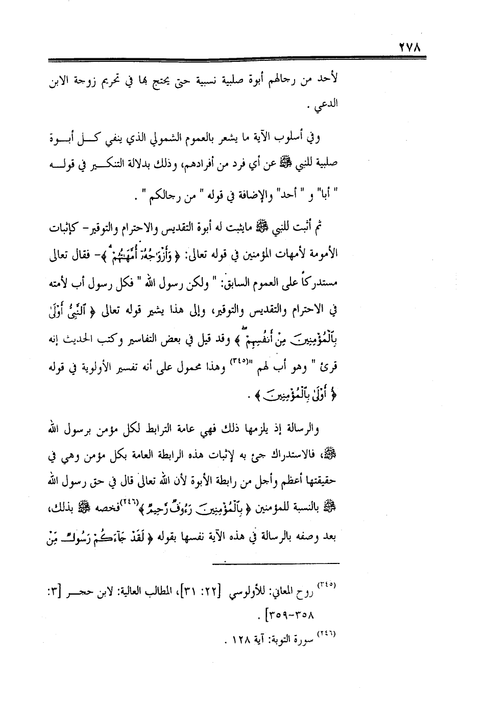 والرسالة إذ يلزمها ذلك فهي عامة الترابط لكل مؤمن برسول الله - صلى الله عليه وسلم -، فالاستدراك جيء به لإثبات هذه الرابطة العامة بكل مؤمن وهى في حقيقتها أعظم وأجل من رابطة الأبوة لأن الله تعالى قال في حق رسول الله - صلى الله عليه وسلم - بالنسبة للمؤمنين (بِالْمُؤْمِنِينَ رَءُوفٌ رَحِيمٌ) فخصه - صلى الله عليه وسلم - بذلك، بعد وصفه بالرسالة في هذه الآية نفسها بقوله (لَقَدْ جَاءَكُمْ رَسُولٌ مِنْ أَنْفُسِكُمْ)