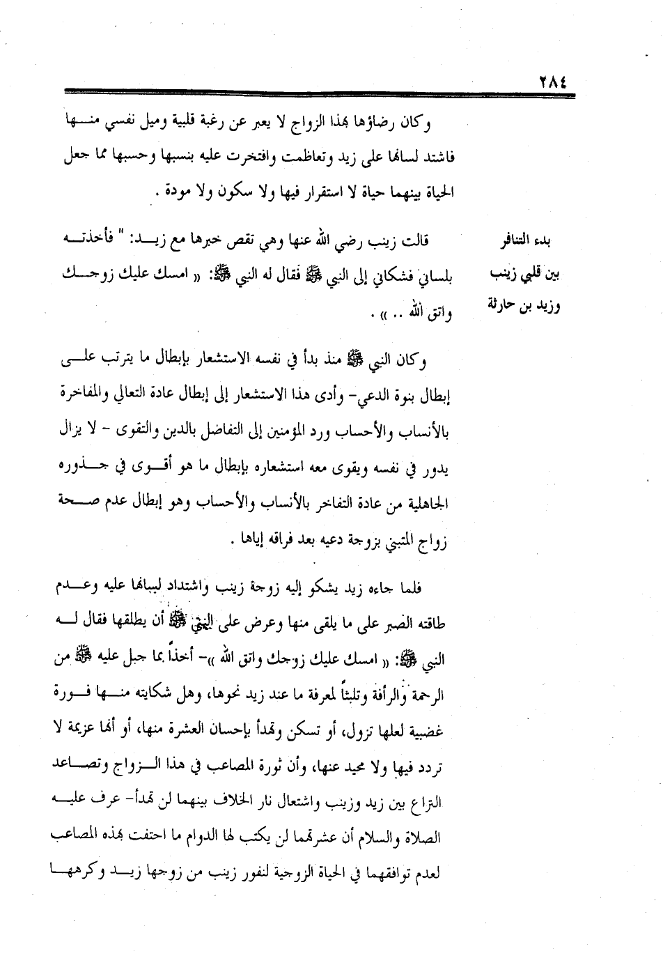 فلما جاءه زيد يشكو إليه زوجه زينب واشتداد لسانها عليه وعدم طاقته الصبر على ما يلقى منها وعرض على النبي - صلى الله عليه وسلم - أن يطلقها فقال له النبي - صلى الله عليه وسلم -: " أمسك عليك زوجك واتق الله " - أخذاً بما جُبل عليه - صلى الله عليه وسلم - من الرحمة والرأفة وتلبثاً لمعرفة ما عند زيد نحوها، وهل شكايته منها فورة غضبية لعلها تزول، أو تسكن وتهدأ بإحسان العشرة منها، أو أنها عزيمة لا تردد فيها ولا محيد عنها، وأن ثورة المصاعب في هذا الزواج وتصاعد النزاع بين زيد وزينب واشتعال نار الخلاف بينهما لن تهدأ - عرف عليه الصلاة والسلام أن عشرتهما لن يكتب لها الدوام ما احتفت بهذه المصاعب لعدم توافقهما في الحياة الزوجية لنفور زينب من زوجها زيد وكرهها