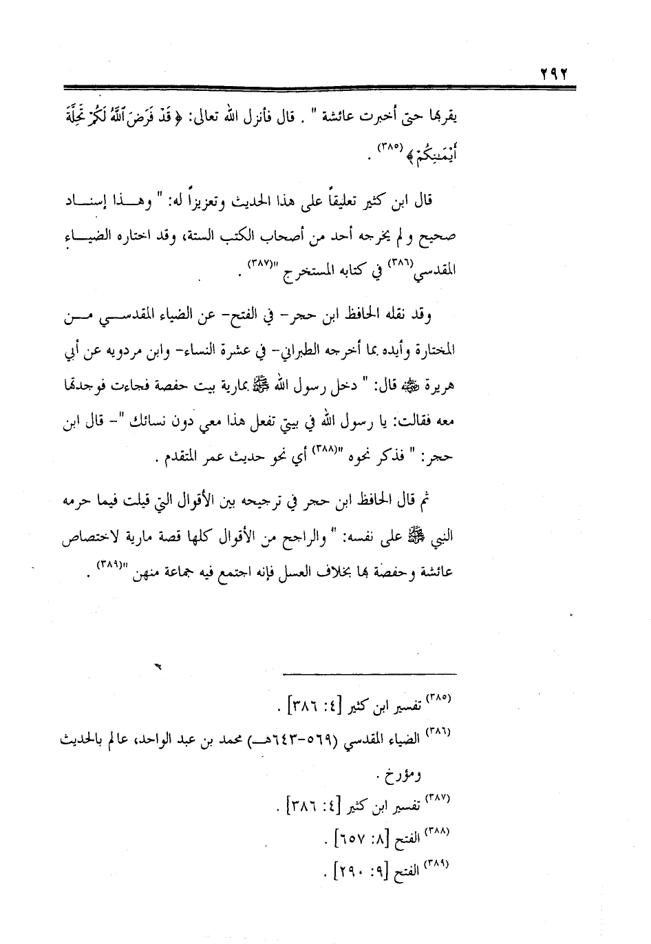 وقد نقله الحافظ ابن حجر -في الفتح- عن الضياء المقدسي من المختارة وأيده بما أخرجه الطبراني -في عشرة النساء- وابن مردويه عن أبي هريرة - رضي الله عنه - قال: " دخل رسول الله - صلى الله عليه وسلم - بمارية بيت حفصة فجاءت فوجدتها معه فقالت: يا رسول الله في بيتي تفعل هذا معي دون نسائك " - قال ابن حجر: " فذكر نحوه " أي نحو حديث عمر المتقدم.