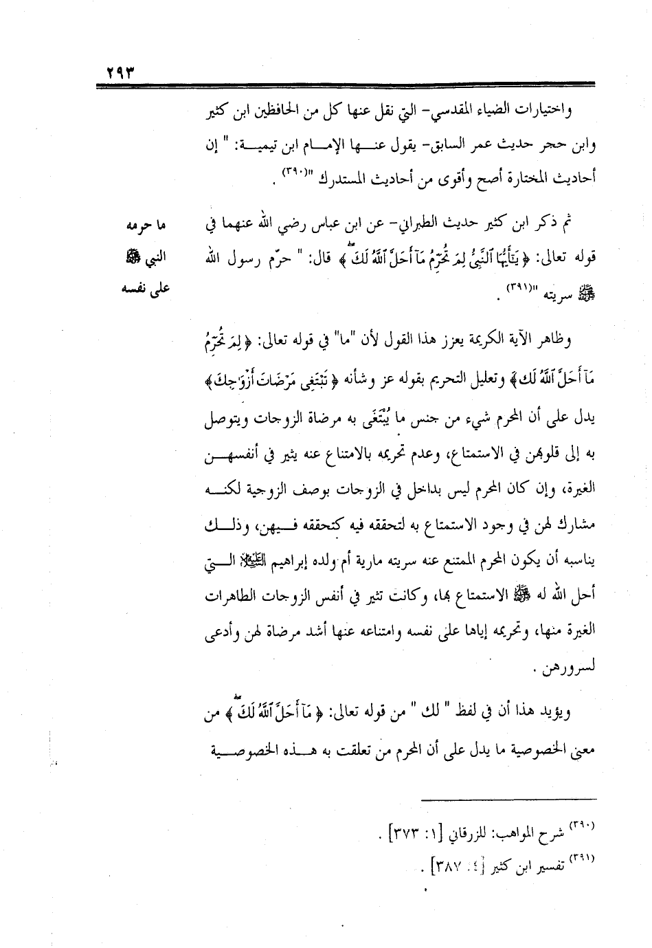 ثم ذكر ابن كثير حديث الطبراني - عن ابن عباس رضي الله عنهما في قوله تعالى: (يَا أَيُّهَا النَّبِيُّ لِمَ تُحَرِّمُ مَا أَحَلَّ اللهُ لَكَ) قال: " حرّم رسول الله - صلى الله عليه وسلم - سريته ".
