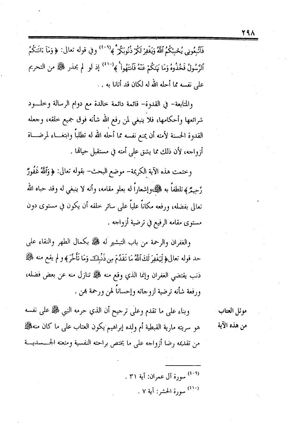 فَاتَّبِعُونِي يُحْبِبْكُمُ اللهُ وَيَغْفِرْ لَكُمْ ذُنُوبَكُمْ) وفي قوله تعالى: (وَمَا آتَاكُمُ الرَّسُولُ فَخُذُوهُ وَمَا نَهَاكُمْ عَنْهُ فَانْتَهُوا) إذ لو لم يحذر - صلى الله عليه وسلم - من التحريم على نفسه مما أحله الله له لكان قد أتانا به.
