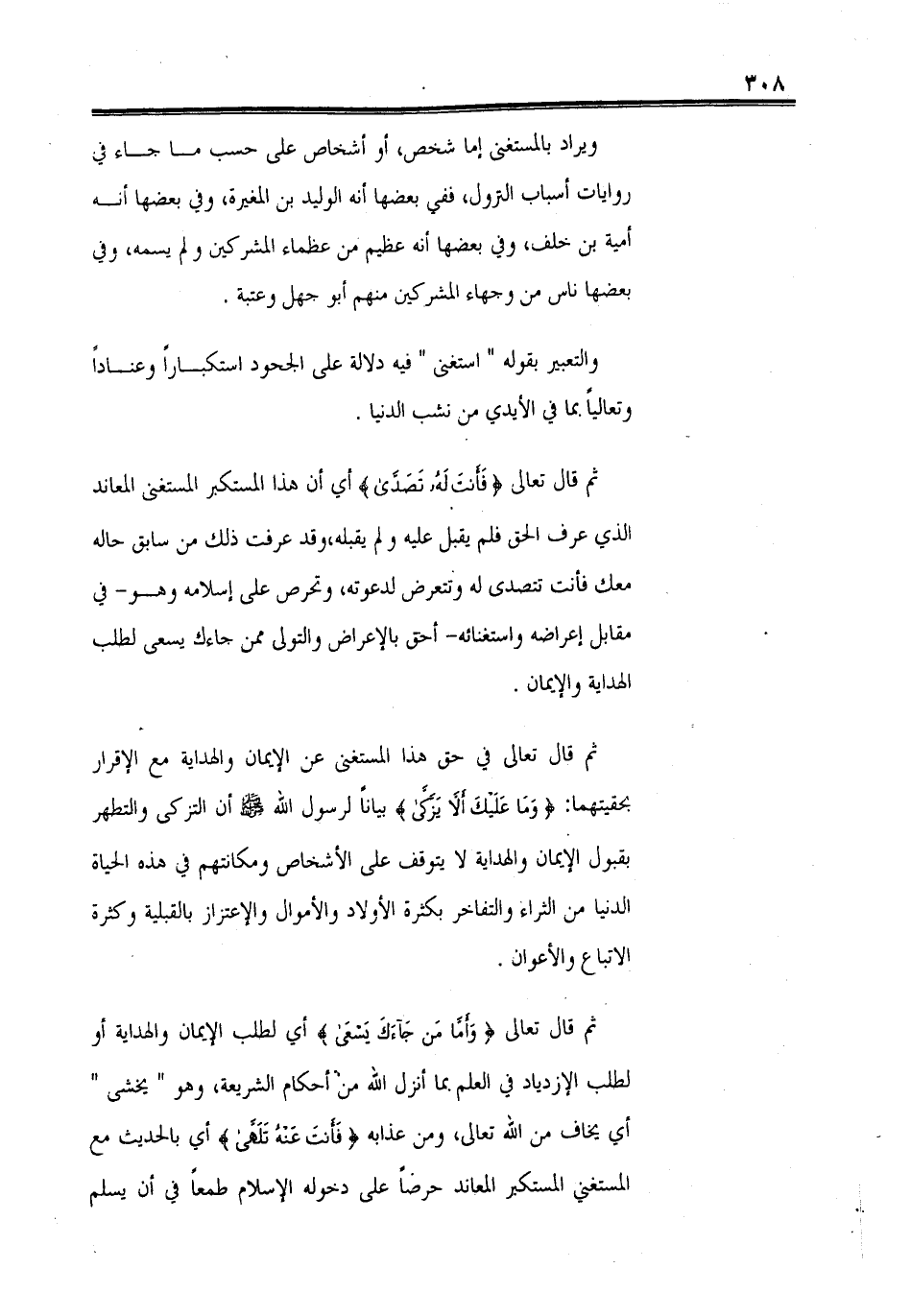 ثم قال تعالى (فَأَنْتَ لَهُ تَصَدَّى) أي أن هذا المستكبر المستغي المعاند الذي عرف الحق فلم يقبل عليه ولم يقبله، وقد عرفت ذلك من سابق حاله معك فأنت تتصدى له وتتعرض لدعوته، وتحرص على إسلامه وهو- في مقابل إعراضه واستغنائه- أحق بالإعراض والتولي ممن جاءك يسعى لطلب الهداية والإيمان.