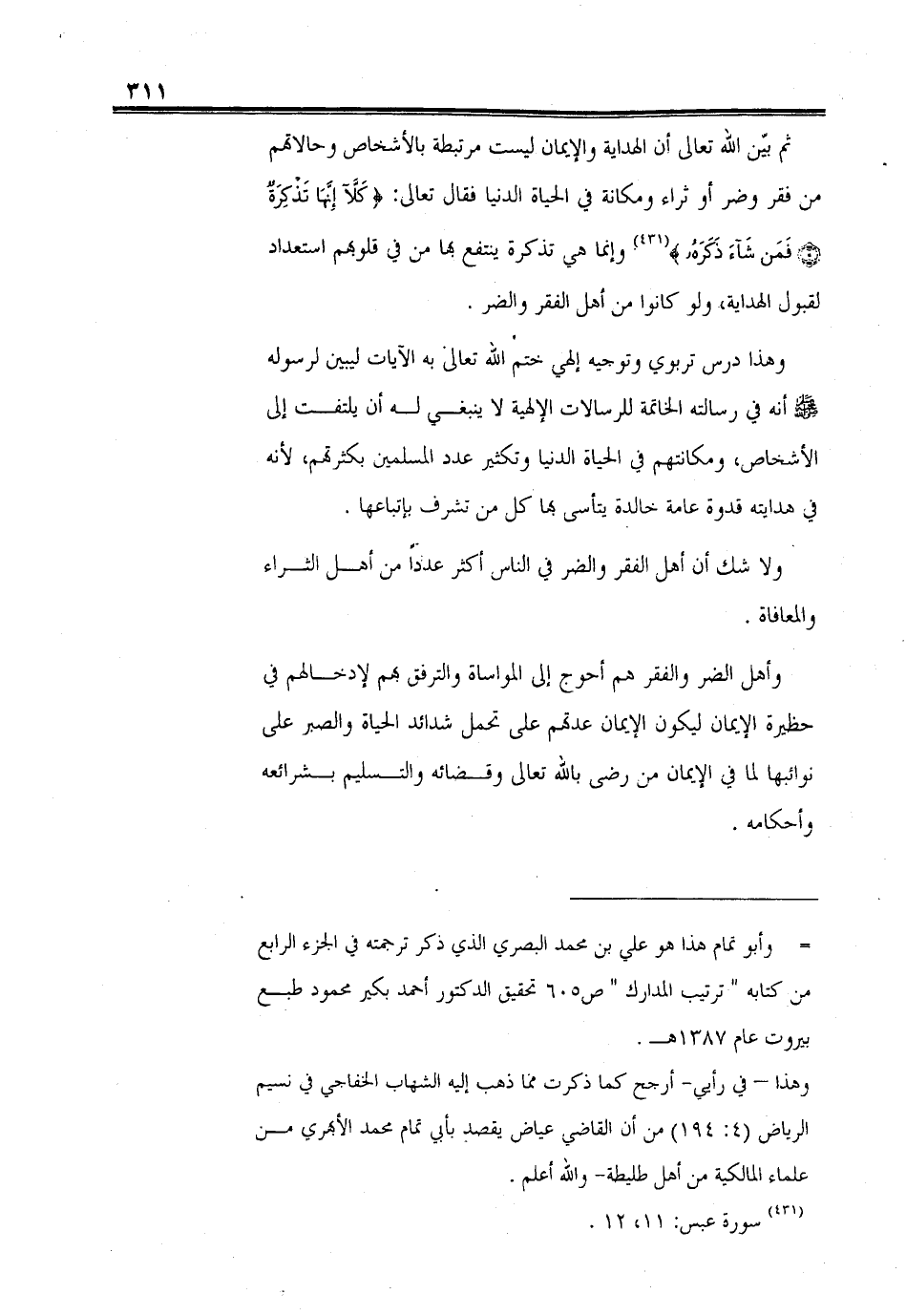 ثم بيّن الله تعالى أن الهداية والإيمان ليست مرتبطة بالأشخاص وحالاتهم من فقر وضر أو ثراء ومكانة في الحياة الدنيا فقال تعالى: (كَلَّا إِنَّهَا تَذْكِرَةٌ (11) فَمَنْ شَاءَ ذَكَرَهُ (12)). وإنما هي تذكرة ينتفع بها من في قلوبهم استعداد لقبول الهداية، ولو كانوا من أهل الفقر والضر.
