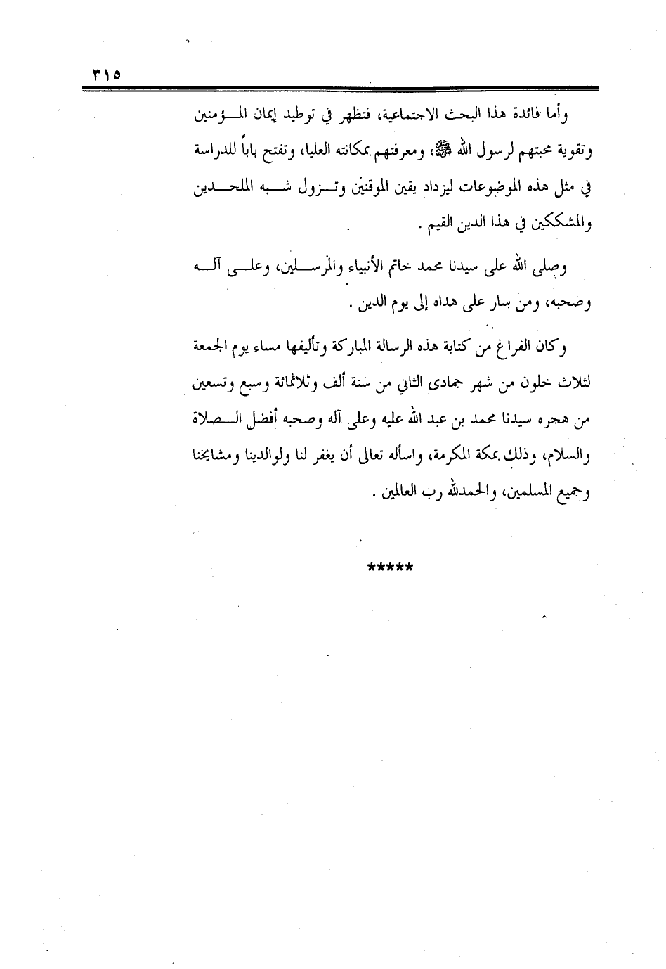 وكان الفراغ من كتابة هذه الرسالة المباركة وتأليفها مساء يوم الجمعة لثلاث خلون من شهر جمادى الثاني من سنة ألف وثلاثمائة وسبع وتسعين من هجرة سيدنا محمد بن عبد الله عليه وعلى آله وصحبه أفضل الصلاة والسلام، وذلك بمكة المكرمة، واسأله تعالى أن يغفر لنا ولوالدينا ومشايخنا وجميع المسلمين، والحمد لله ربِّ العالمين.
