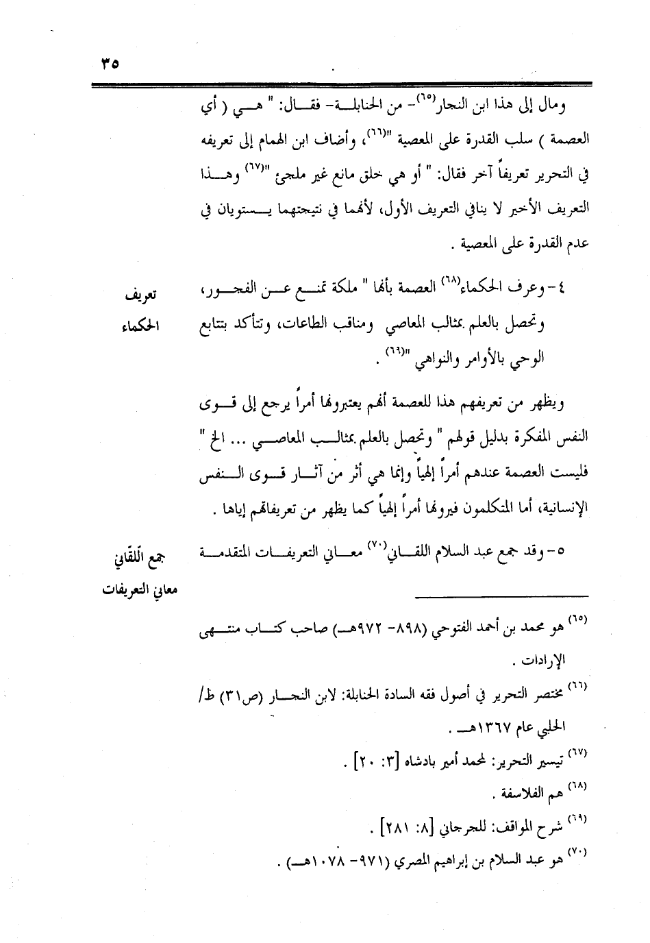 ومال إلى هذا ابن النجار -من الحنابلة- فقال: " هي (أي العصمة) سلب القدرة على المعصية "، وأضاف ابن الهمام إلى تعريفه في التحرير تعريفاً آخر فقال: " أو هي خلق مانع غير ملجئ " وهذا التعريف الأخير لا ينافي التعريف الأول، لأنهما في نتيجتهما يستويان في عدم القدرة على المعصية.