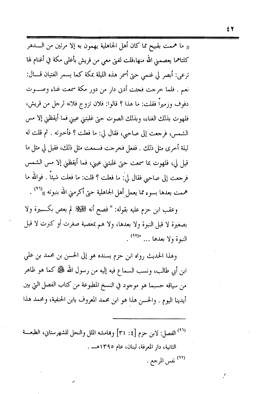 وعقب ابن حزم عليه بقوله: " فصح أنه - صلى الله عليه وسلم - لم يعص بكبيرة ولا بصغيرة لا قبل النبوة ولا بعدها، ولا هم بمعصية صغرت أو كبرت لا قبل النبوة ولا بعدها. . . ".