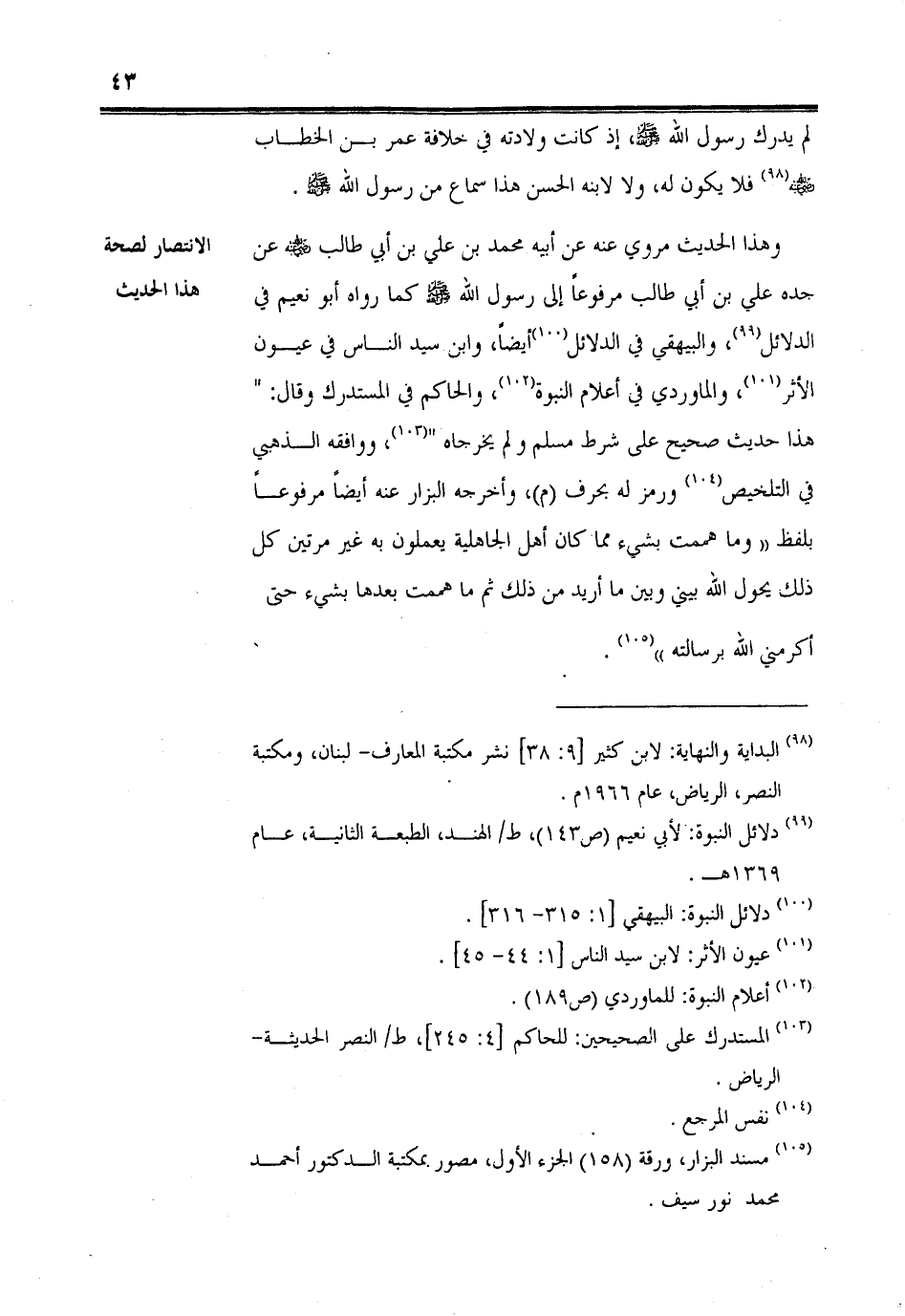 وهذا الحديث مروي عنه عن أبيه محمد بن علي بن أبي طالب عن جده علي بن أبي طالب مرفوعاً إلى رسول الله - صلى الله عليه وسلم - " كما رواه أبو نعيم في الدلائل، والبيهقي في الدلائل أيضاً، وابن سيد الناس في عيون الأثر، والماوردي في أعلام النبوة، والحاكم في المستدرك وقال: " هذا حديث صحيح على شرط مسلم ولم يخرجاه، ووافقه الذهبي في التلخيص ورمز له بحرف (م)، وأخرجه البزار عنه أيضاً مرفوعاً بلفظ " وما هممت بشيء مما كان أهل الجاهلية يعملون به غير مرتين كل ذلك يحول الله بيني وبين ما أريد من ذلك ثم ما هممت بعدها بشيء حتى أكرمني الله برسالته ".