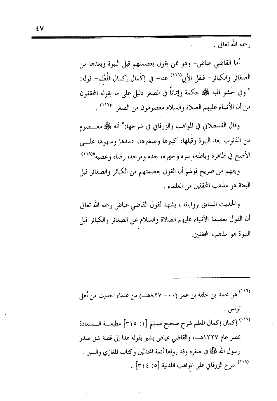 أما القاضي عياض -وهو ممن يقول بعصمتهم قبل النبوة وبعدها من الصغائر والكبائر- فنقل الأبي عنه -في إكمال إكمال المُعْلِم- قوله: " وفي حشو قلبه - صلى الله عليه وسلم - حكمة وإيماناً في الصغر دليل على ما يقوله المحققون من أن الأنبياء عليهم الصلاة والسلام معصومون من الصغر.