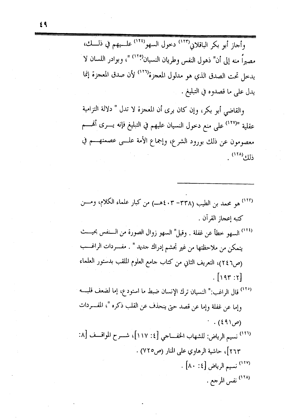 وأجاز أبو بكر الباقلاني دخول السهو عليهم في ذلك، مصيراً منه إلى أن " ذهول النفس وطريان النسيان "، وبوادر اللسان لا يدخل تحت الصدق الذي هو مدلول المعجزة؛ لأن صدق المعجزة إنما يدل على ما قصدوه في التبليغ.