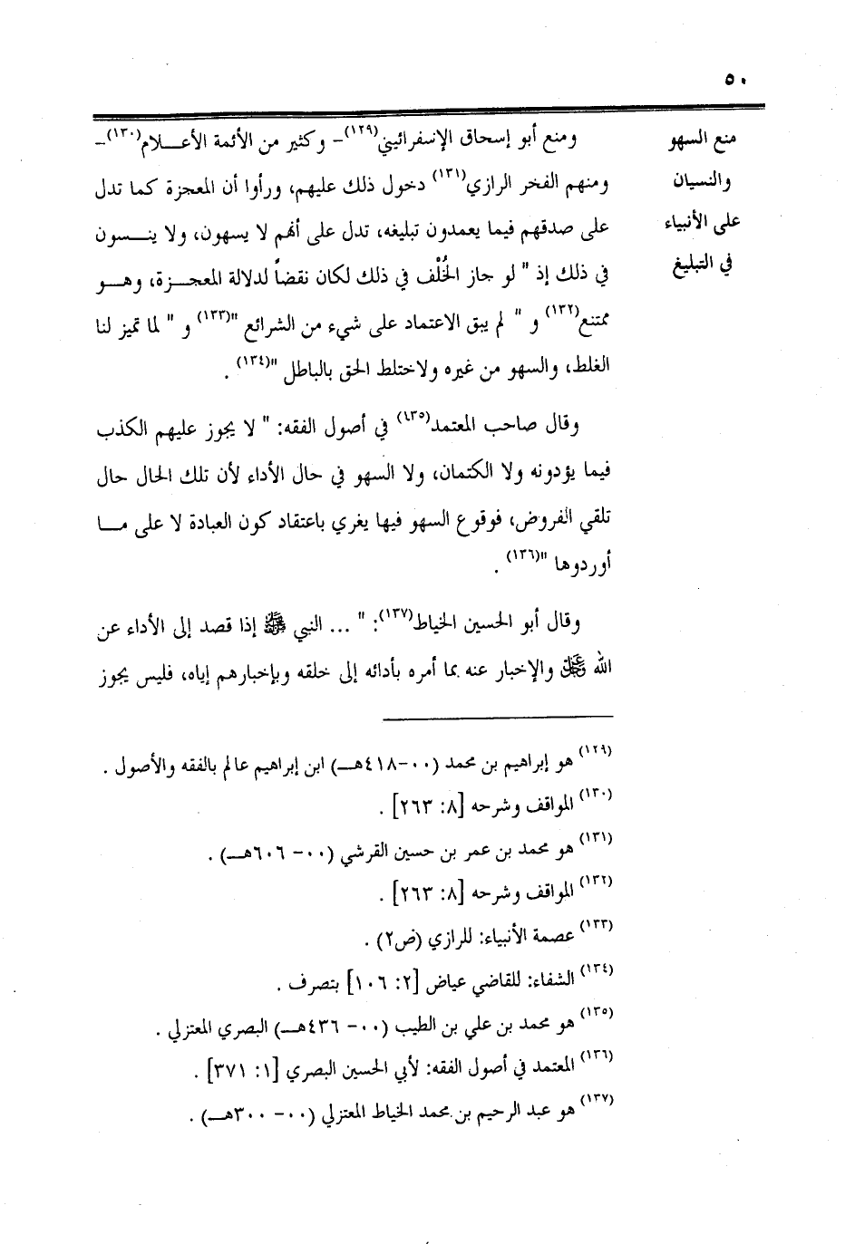 ومنع أبو إسحاق الإسفرائيني -وكثير من الأئمة الأعلام- ومنهم الفخر الرازي دخول ذلك عليهم، ورأوا أن المعجزة كما تدل على صدقهم فيما يعمدون تبليغه، تدل على أنَّهم لا يسهون، ولا ينسون في ذلك إذ " لو جاز الخُلْف في ذلك لكان نقضاً لدلالة المعجزة، وهو ممتنع و " لم يبق الاعتماد على شيء من الشرائع " و" لما تميز لنا الغلط، والسهو من غيره ولاختلط الحق بالباطل ".
