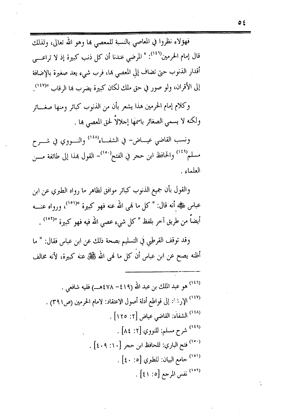 وكلام إمام الحرمين هذا يشعر بأن من الذنوب كبائر ومنها صغائر ولكنه لا يسمي الصغائر باسمها إجلالاً لحق المعصي بها.