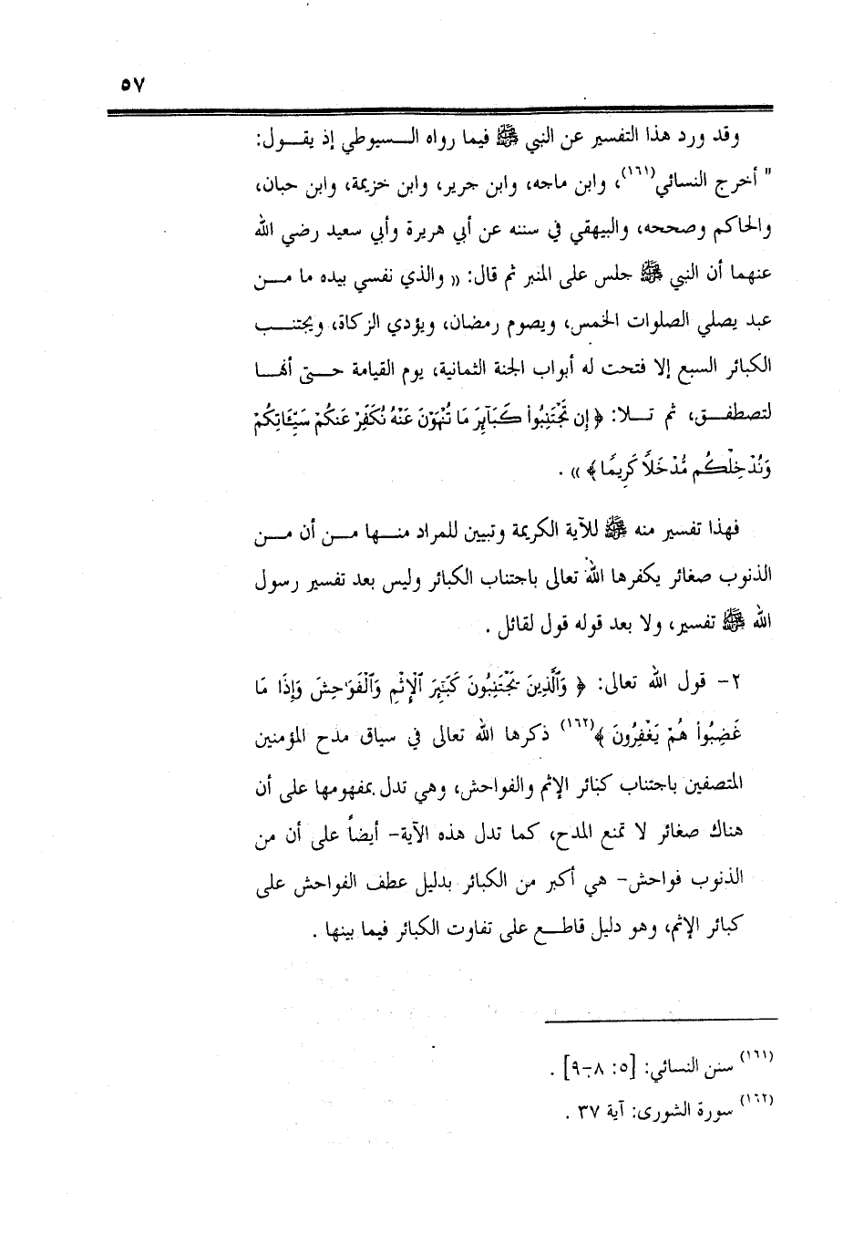 ذكرها الله تعالى في سياق مدح المؤمنين المتصفين باجتناب كبائر الإثم والفواحش، وهي تدل بمفهومها على أن هناك صغائر لا تمنع المدح، كما تدل هذه الآية -أيضاً على أن من الذنوب فواحش- هي أكبر من الكبائر بدليل عطف الفواحش على كبائر الإثم، وهو دليل قاطع على تفاوت الكبائر فيما بينها.