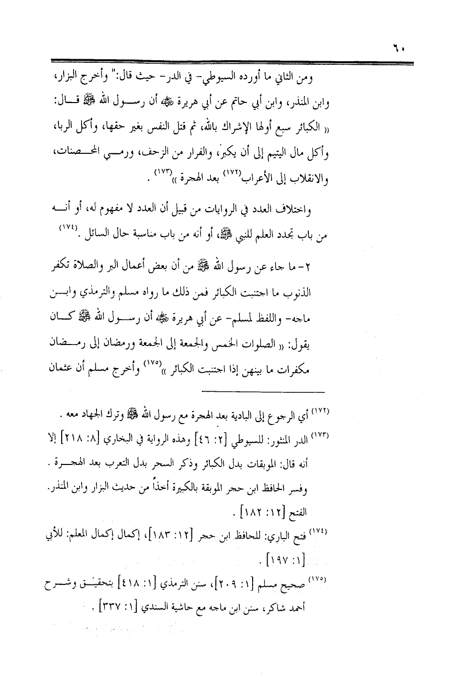 ومن الثاني ما أورده السيوطي -في الدر- حيث قال: " وأخرج البزار، وابن المنذر، وابن أبي حاتم عن أبي هريرة - رضي الله عنه - أن رسول الله - صلى الله عليه وسلم - قال: " الكبائر سبع أولها الإشراك بالله، ثم قتل النفس بغير حقها، وأكل الربا، وأكل مال اليتيم إلى أن يكبر، والفرار من الزحف، ورمي المحصنات، والانقلاب إلى الأعراب بعد الهجرة ".