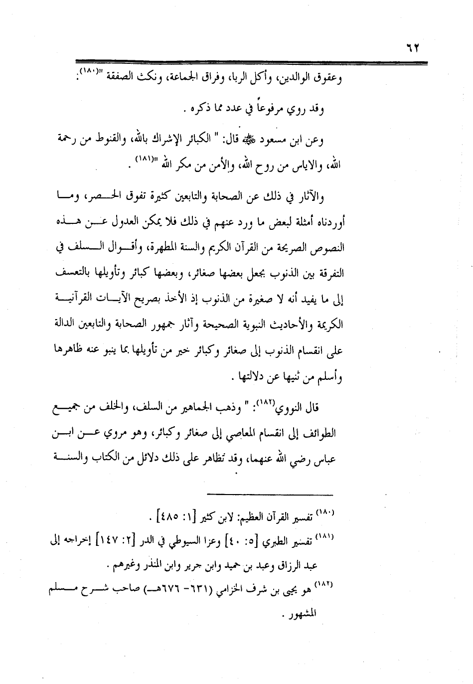 قال النووي: " وذهب الجماهير من السلف، والخلف من جميع الطوائف إلى انقسام المعاصي إلى صغائر وكبائر، وهو مروي عن ابن عباس رضي الله عنهما، وقد تظاهر على ذلك دلائل من الكتاب والسنة