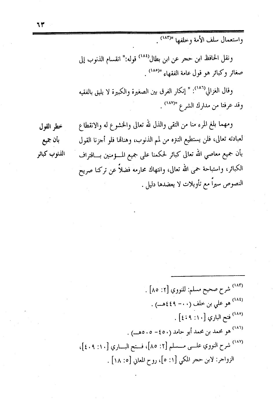ونقل الحافظ ابن حجر عن ابن بطال قوله:. " انقسام الذنوب إلى صغائر وكبائر هو قول عامة الفقهاء ".