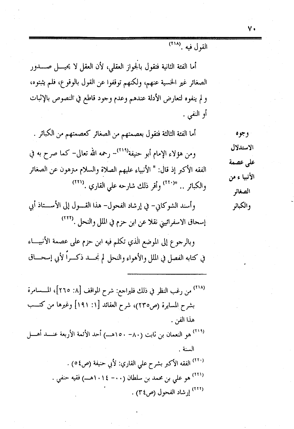ومن هؤلاء الإمام أبو حنيفة - رحمه الله تعالى - كما صرح به في الفقه الأكبر إذ قال: " الأنبياء عليهم الصلاة والسلام منزهون عن الصغائر والكبائر " وأقر ذلك شارحه على القاري.