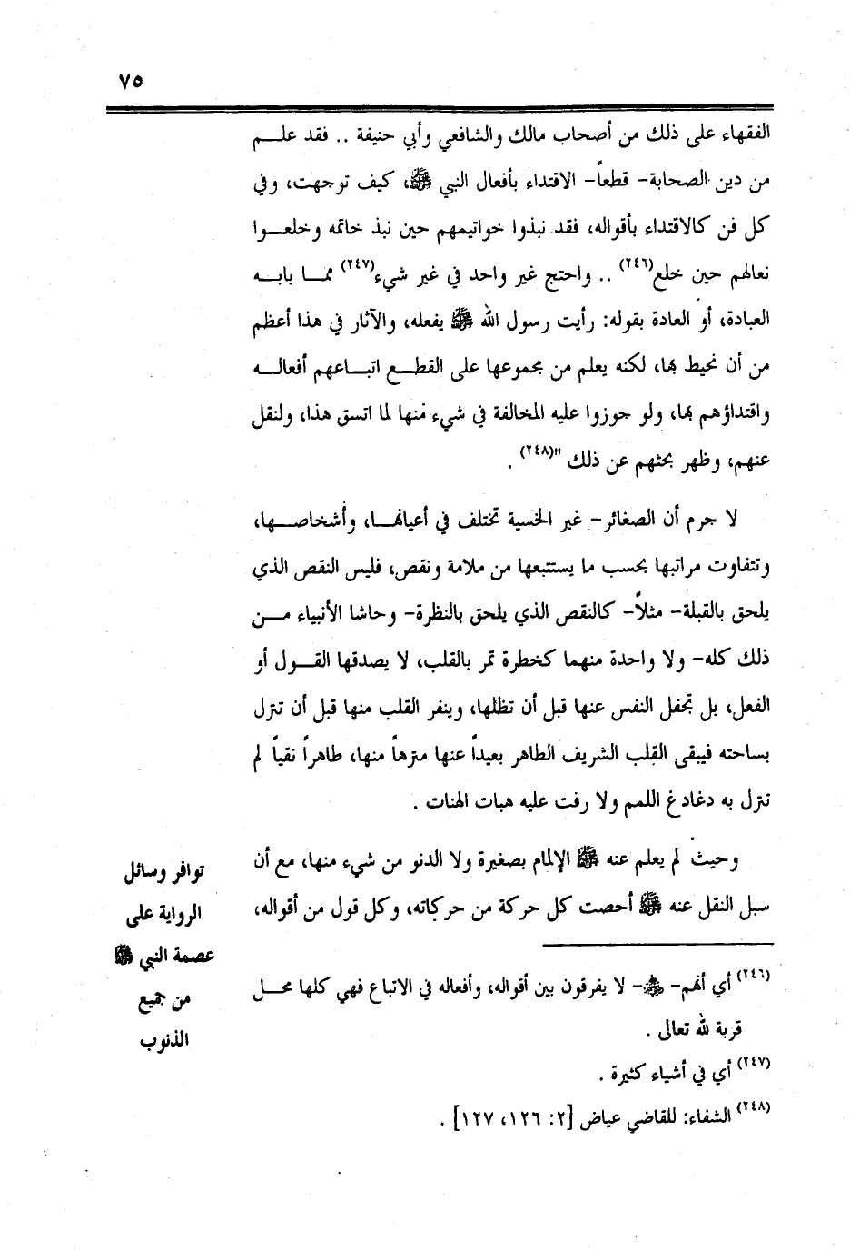 وحيث لم يعلم عنه - صلى الله عليه وسلم - الإلمام بصغيرة ولا الدنو من شيء منها، مع أن سبل النقل عنه - صلى الله عليه وسلم - أحصت كل حركة من حركاته، وكل قول من أقواله،