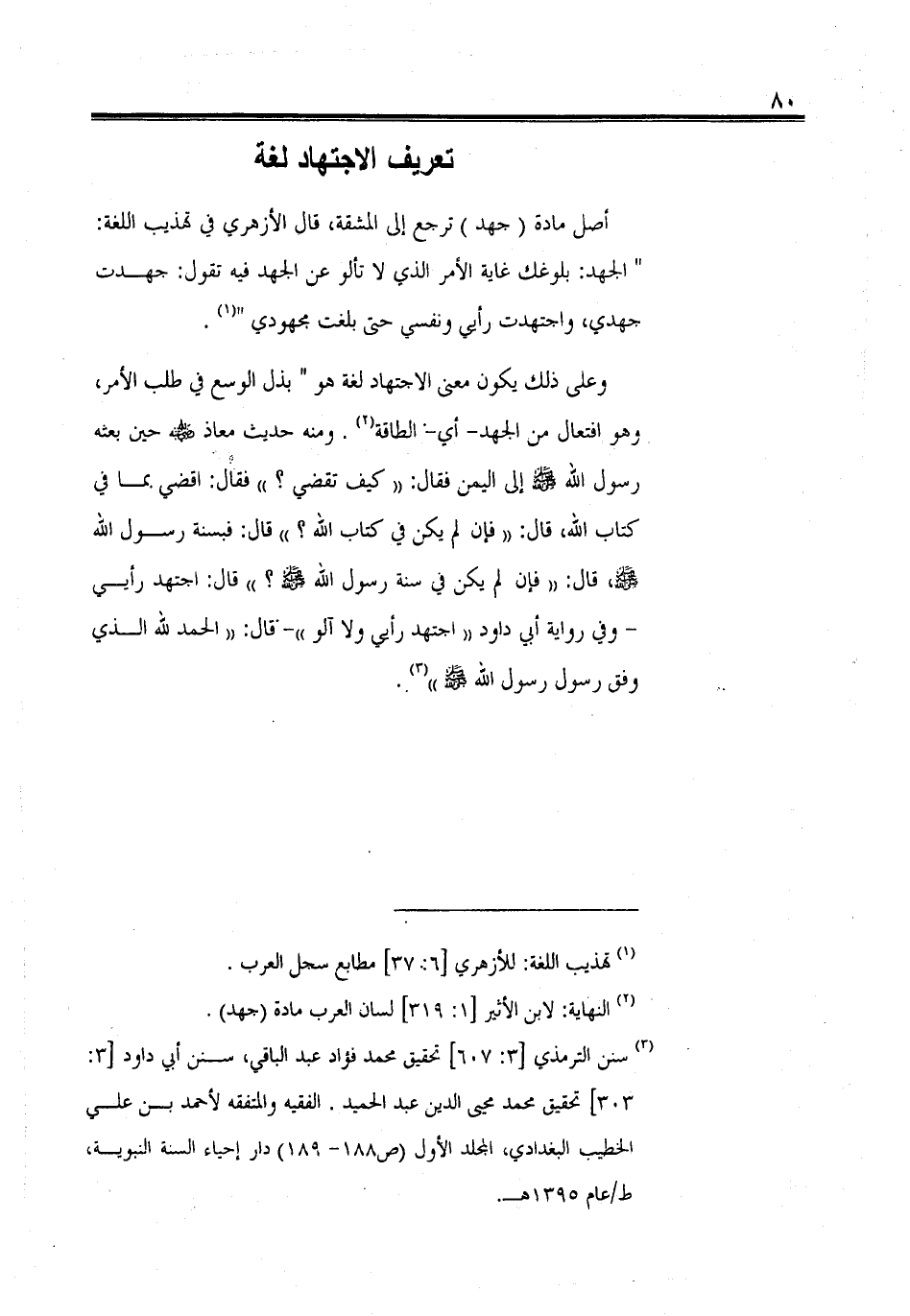وعلى ذلك يكون معنى الاجتهاد لغة هو " بذل الوسع في طلب الأمر، وهو افتعال من الجهد -أي- الطاقة. ومنه حديث معاذ - رضي الله عنه - حين بعثه رسول الله - صلى الله عليه وسلم - إلى اليمن فقال: " كيف تقضي؟ " فقال: اقضي بما في كتاب الله، قال: " فإن لم يكن في كتاب الله؟ " قال: فبسنة رسول الله - صلى الله عليه وسلم -، قال: " فإن لم يكن في سنة رسول الله - صلى الله عليه وسلم -؟ " قال: اجتهد رأيي - وفي رواية أبي داود " اجتهد رأيي ولا آلو " - قال: " الحمد لله الذي وفق رسول رسول الله - صلى الله عليه وسلم ".