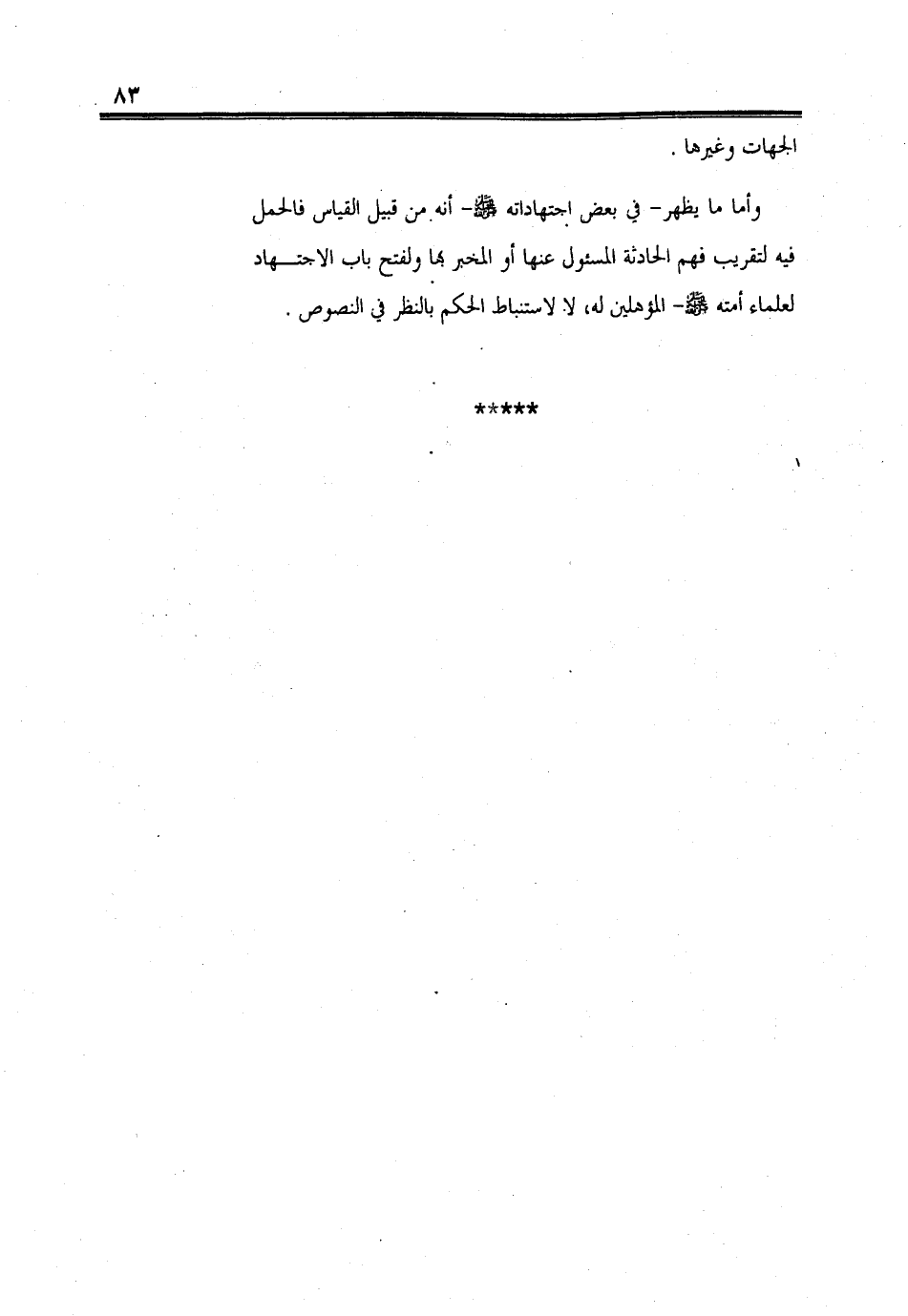 وأما ما يظهر -في بعض اجتهاداته- صلى الله عليه وسلم - أنه من قبيل القياس فالحمل فيه لتقريب فهم الحادثة المسئول عنها أو المخبر بها ولفتح باب الاجتهاد لعلماء أمته - صلى الله عليه وسلم - المؤهلين له، لا لاستنباط الحكم بالنظر في النصوص.