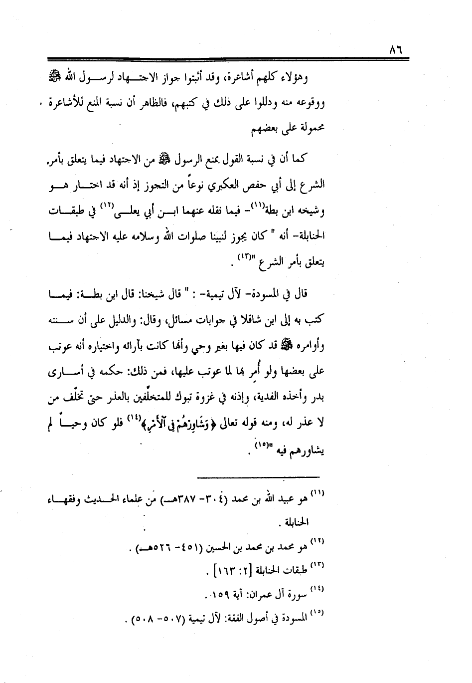 قال في المسودة -لآل تيمية-: " قال شيخنا: قال ابن بطة: فيما كتب به إلى ابن شاقلا في جوابات مسائل، وقال: والدليل على أن سنته وأوامره - صلى الله عليه وسلم - قد كان فيها بغير وحي وأنها كانت بآرائه واختياره أنه عوتب على بعضها ولو أٌُمِر بها لما عوتب عليها، فمن ذلك: حكمه فِي أسارى بدر وأخذه الفدية، وإذنه في غزوة تبوك للمتخلفين بالعذر حتى تخلف من لا عذر له، ومنه قوله تعالى (وَشَاوِرْهُمْ فِي الْأَمْرِ) فلو كان وحياً لم يشاورهم فيه ".