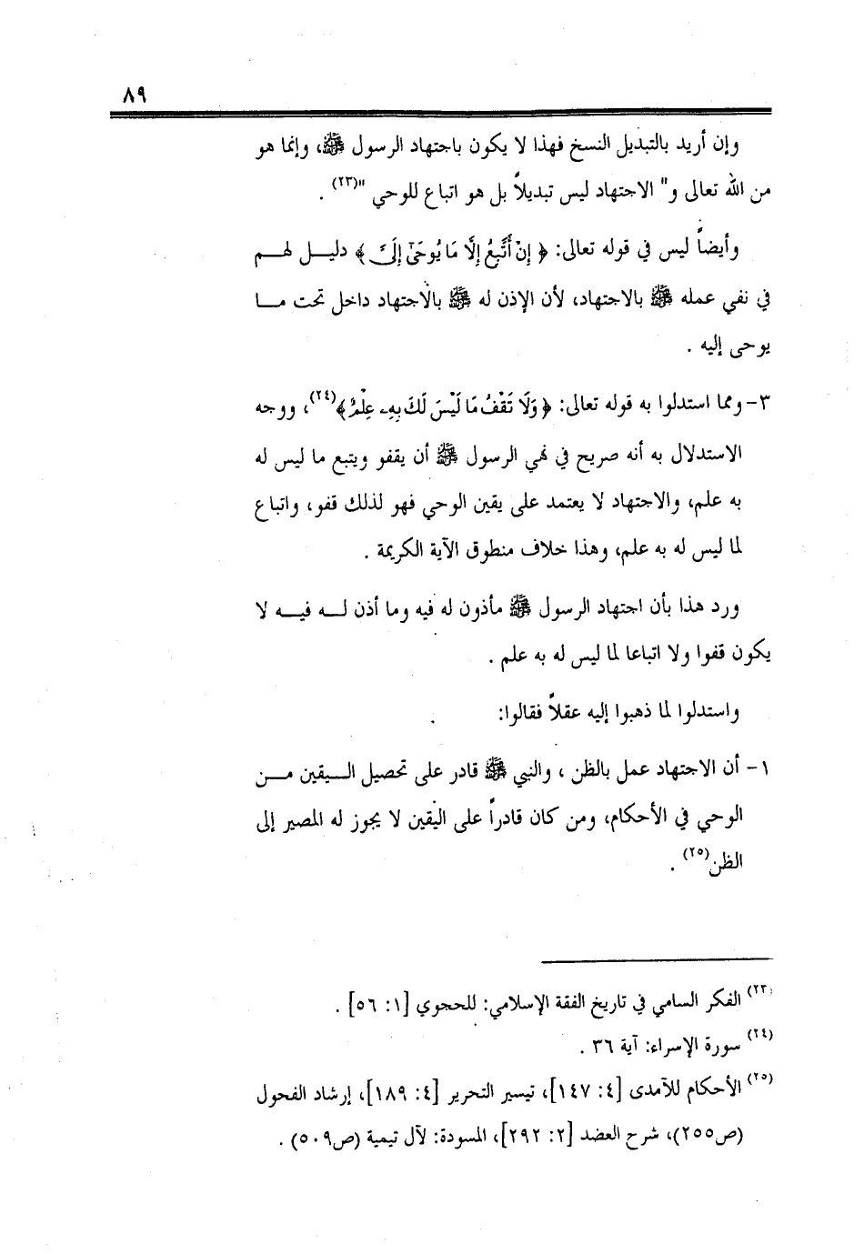 3 - ومما استدلوا به قوله تعالى: (وَلَا تَقْفُ مَا لَيْسَ لَكَ بِهِ عِلْمٌ)، ووجه الاستدلال به أنه صريح في نهي الرسول - صلى الله عليه وسلم - أن يقفو ويتبع ما ليس له به علم، والاجتهاد، يعتمد على يقين الوحى فهو لذلك قفو، واتباع لما ليس له به علم، وهذا خلاف منطوق الآية الكريمة.