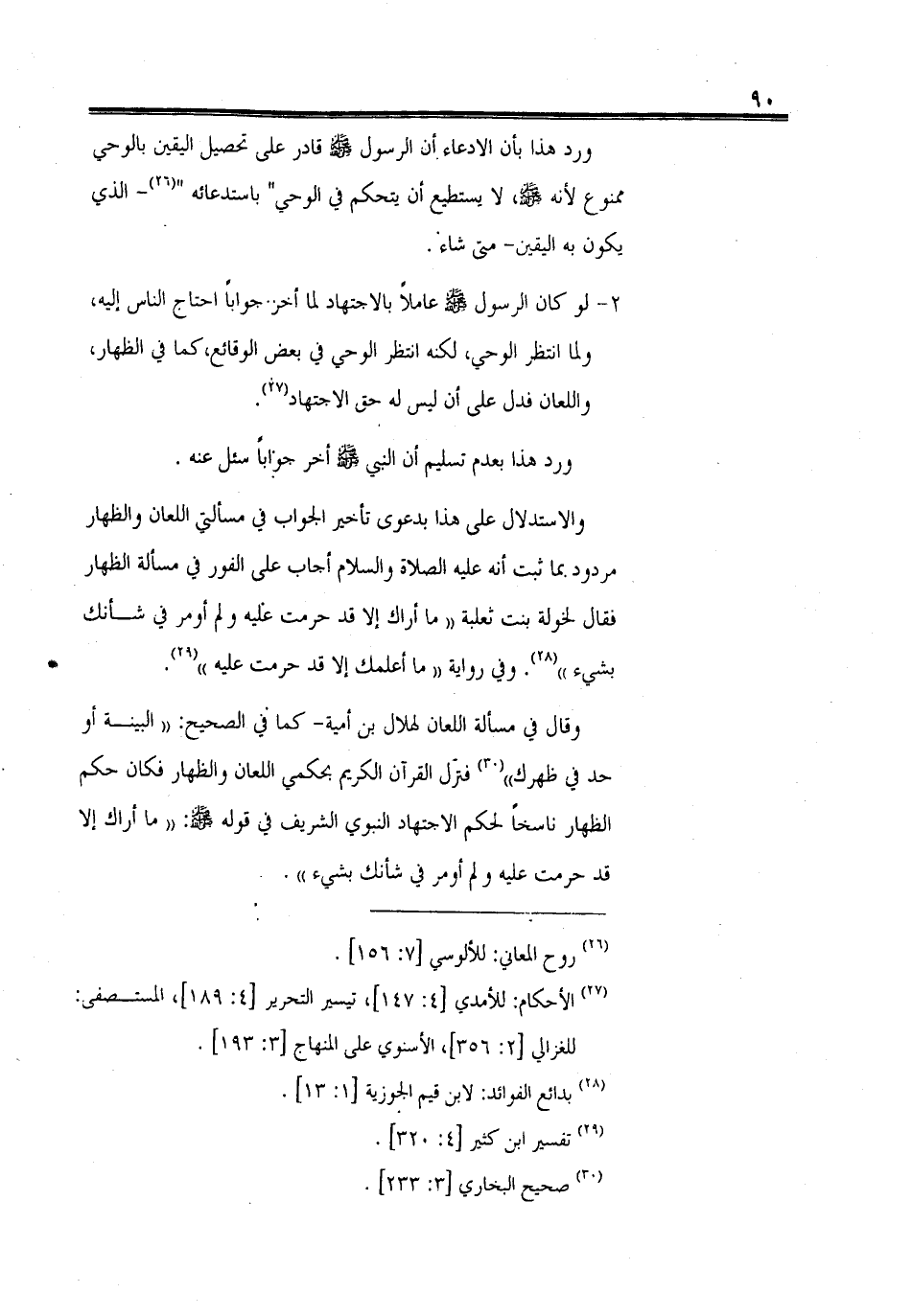وقال في مسألة اللعان لهلال بن أمية - كما في الصحيح: " البينة أو حد في ظهرك " فنزل القرآن الكريم بحكمي اللعان والظهار فكان حكم الظهار ناسخاً لحكم الاجتهاد النبوي الشريف في قوله - صلى الله عليه وسلم -: " ما أراك إلا قد حرمت عَليه ولم أومر في شأنك بشيء ".