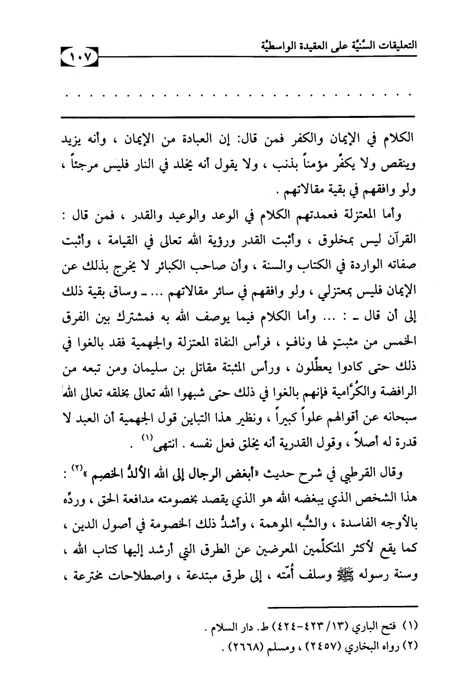 الكلام في الإيمان والكفر فمن قال: إن العبادة من الإيمان، وأنه يزيد وينقص ولا يكفِّر مؤمناً بذنب، ولا يقول أنه يخلد في النار فليس مرجئاً، ولو وافقهم في بقية مقالاتهم.