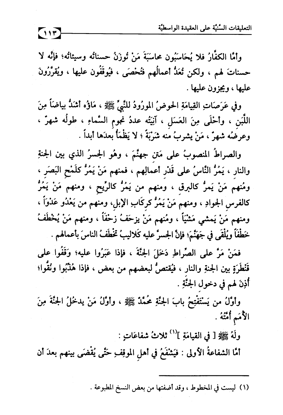 وَالصِّرَاطُ مَنْصُوبٌ عَلَى مَتْنِ جَهَنَّمَ، وَهُوَ الْجِسْرُ الَّذِي بَيْنَ الْجَنَّةِ وَالنَّارِ، يَمُرُّ النَّاسُ عَلَيْهِ عَلَى قَدْرِ أَعْمَالِهِمْ، فَمِنْهُمْ مَنْ يَمُرُّ كَلَمْحِ الْبَصَرِ، وَمِنْهُم مَن يَمُرُّ كَالْبَرْقِ، وَمِنْهُم مَن يَمُرُّ كَالرِّيحِ، ومِنْهُم مَن يَمُرُّ كَالْفَرَسِ الْجَوَادِ، وَمِنْهُم مَن يَمُرُّ كَرِكَابِ الإِبِلِ، ومِنْهُم مَن يَعْدُو عَدْوًا، وَمِنْهُم مَن يَمْشِي مَشْيًا، وَمِنْهُم مَن يَزْحَفُ زَحْفًا، وَمَنْهُم مَن يُخْطَفُ خَطْفًا وَيُلْقَى فِي جَهَنَّمَ؛ فَإِنَّ الْجِسرَ عَلَيْهِ كَلاَلِيبُ تَخْطِفُ النَّاسَ بِأَعْمَالِهِم، فَمَنْ مَرَّ عَلَى الصِّرَاطِ؛ دَخَلَ الْجَنَّةَ. فَإِذَا عَبَرُوا عَلَيْهِ؛ وَقَفُوا عَلَى قَنْطَرَةٍ بَيْنَ الْجَنَّةِ وَالنَّارِ، فَيُقْتَصَّ لِبَعْضِهِم مِن بَعْضٍ، فَإِذَا هُذِّبُوا وَنُقُّوا؛ أُذِنَ لَهُمْ فِي دُخُولِ الْجَنَّةِ.