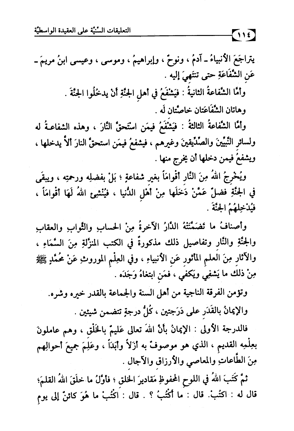 وَتُؤْمِنُ الْفِرْقَةُ النَّاجِيَةُ مِنْ أَهْلِ السُّنَّةِ وَالْجَمَاعَةِ بِالْقَدَرِ خَيْرِهِ وَشَرِّهِ. وَالإِيمَانُ بِالْقَدَرِ عَلَى دَرَجَتَينِ؛ كُلُّ دَرَجَةٍ تَتَضَمَّنُ شَيْئَيْنِ. فَالدَّرَجَةُ الأُولَى: الإيمَانُ بِأَنَّ اللهَ تَعَالَى عَلِيمٌ بِالْخَلْق، ِ وَهُمْ عَامِلُونَ بِعِلْمِهِ الْقَدِيمِ الَّذِي هُوَ مَوْصُوفٌ بِهِ أَزَلاً وَأَبَدًا، وَعَلِمَ جَمِيعَ أَحْوَالِهِم مِّنَ الطَّاعَاتِ وَالْمَعَاصِي وَالأَرْزَاقِ وَالآجَالِ، ثُمَّ كَتَبَ اللهُ فِي اللَّوْحِ الْمَحْفُوظِ مَقَادِيرَ الْخَلْقِ. فَأَوَّلُ مَا خَلَقَ اللهُ الْقَلَمَ قَالَ لَهُ: اكْتُبْ. قَالَ: مَا أَكْتُبُ؟ قَالَ: اكْتُبْ مَا هُوَ كَائِنٌ إِلَى يَوْمِ