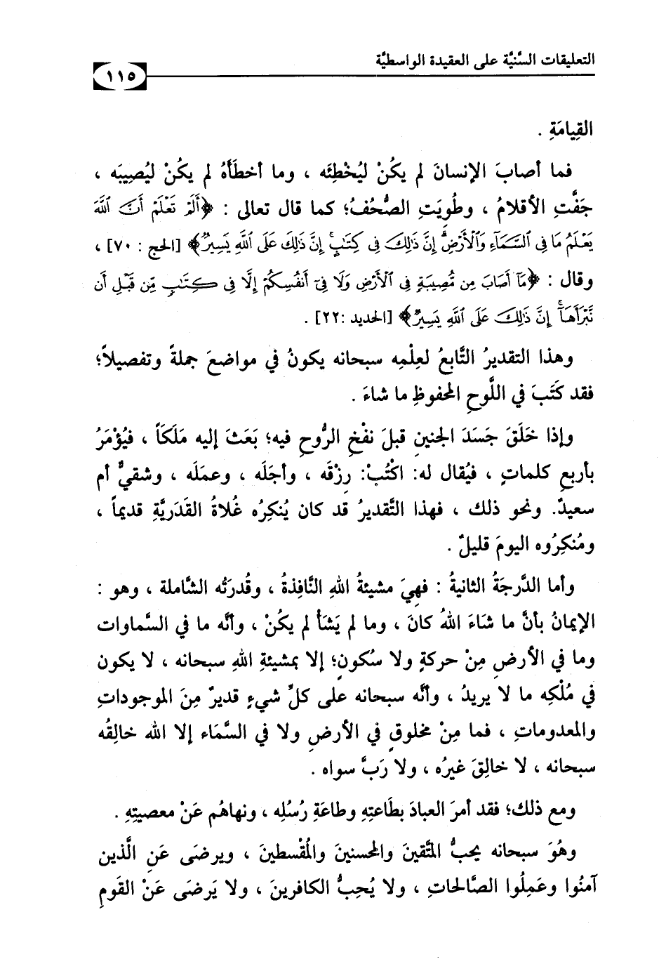 الإِيمَانُ بِأَنَّ مَا شَاءَ اللهُ كَانَ، وَمَا لَمْ يَشَأْ لَمْ يَكُنْ، وَأَنَّهُ مَا فِي السَّمَوَاتِ وَمَا فِي الأَرْضِ مِنْ حَرَكَةٍ وَلاَ سُكُونٍ؛ إلاَّ بِمَشِيئَةِ اللهِ سُبْحَانَهُ، لاَ يَكُونُ فِي مُلْكِهِ مَا لاَ يُرِيدُ، وَأَنَّهُ سُبْحَانَهُ عَلَى كُلِّ شَيْءٍ قَدِيرٌ مِنَ الْمَوْجُودَاتِ وَالْمَعْدُومَاتِ، مَا مِنْ مَخْلُوقٍ فِي الأَرْضِ وَلاَ فِي السَّمَاءِ إلاَّ اللهُ خَالِقُهُ سُبْحَانَهُ، لا خَالِقَ غَيْرُهُ، وَلاَ رَبَّ سِوَاهُ. وَمَعَ ذَلِكَ؛ فَقَدْ أَمَرَ الْعِبَادَ بِطَاعَتِهِ وَطَاعَةِ رُسُلِهِ، وَنَهَاهُمْ عَنْ مَعْصِيَتِهِ. وَهُوَ سُبْحَانَهُ يُحِبُّ الْمُتَّقِينَ وَالْمُحْسِنِينَ وَالْمُقْسِطِينَ، وَيَرْضَى عَنِ الَّذِينَ آمَنُوا وَعَمِلُوا الصَّالِحَاتِ، وَلا يُحِبُّ الْكَافِرِينَ، وَلاَ يَرْضَى عَنِ الْقَوْمِ