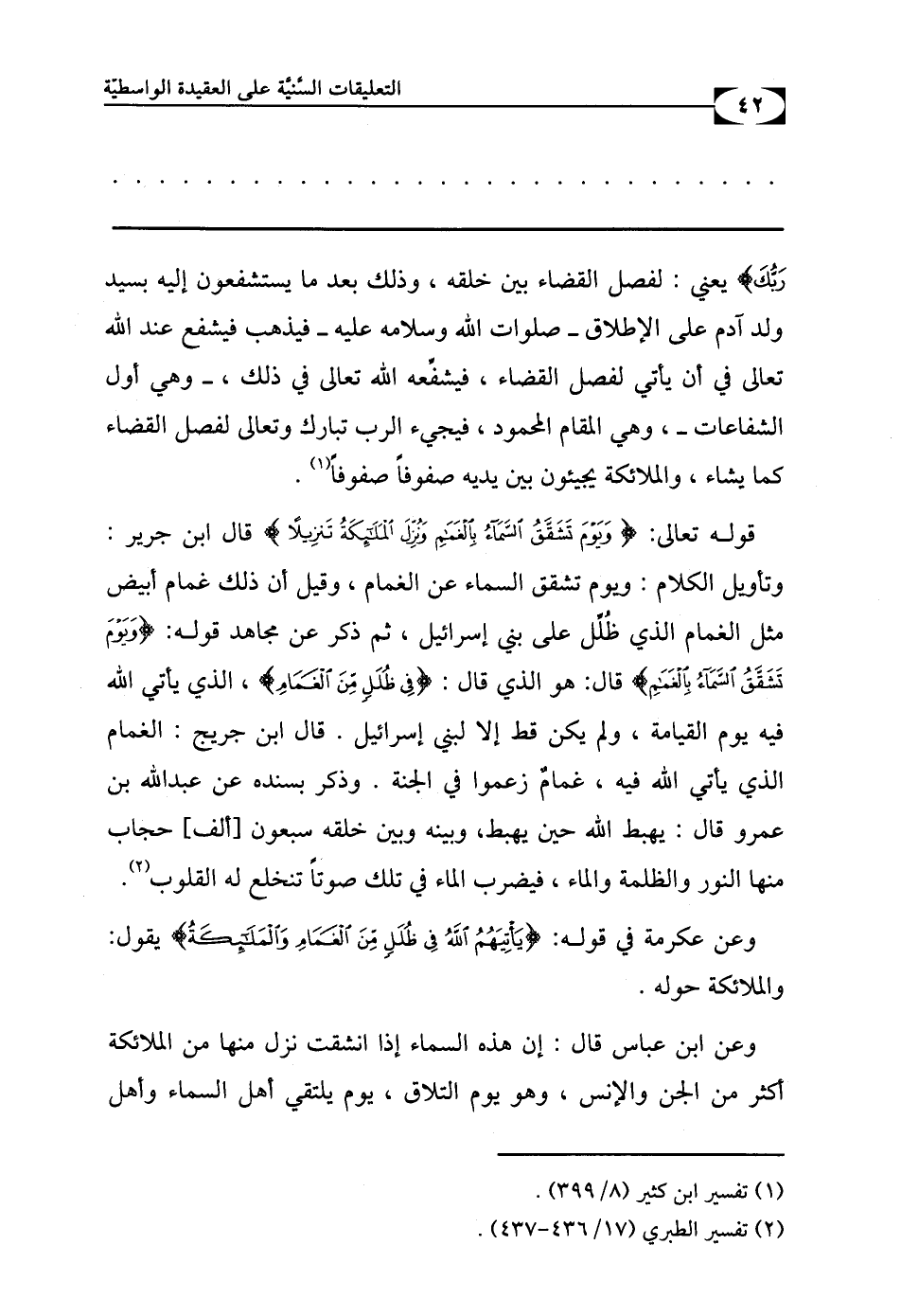 قوله تعالى {وَيَوْمَ تَشَقَّقُ السَّمَاءُ بِالْغَمَامِ وَنُزِّلَ الْمَلائِكَةُ تَنْزِيلا} قال ابن جرير: وتأويل الكلام: ويوم تشقق السماء عن الغمام، وقيل أن ذلك غمام أبيض مثل الغمام الذي ظُلِّل على بني إسرائيل، ثم ذكر عن مجاهد قوله: {وَيَوْمَ تَشَقَّقُ السَّمَاءُ بِالْغَمَامِ} قال: هو الذي قال: {فِي ظُلَلٍ مِنَ الْغَمَامِ} ، الذي يأتي الله فيه يوم القيامة, ولم يكن قط إلا لبني إسرائيل. قال ابن جريج: الغمام الذي يأتي الله فيه