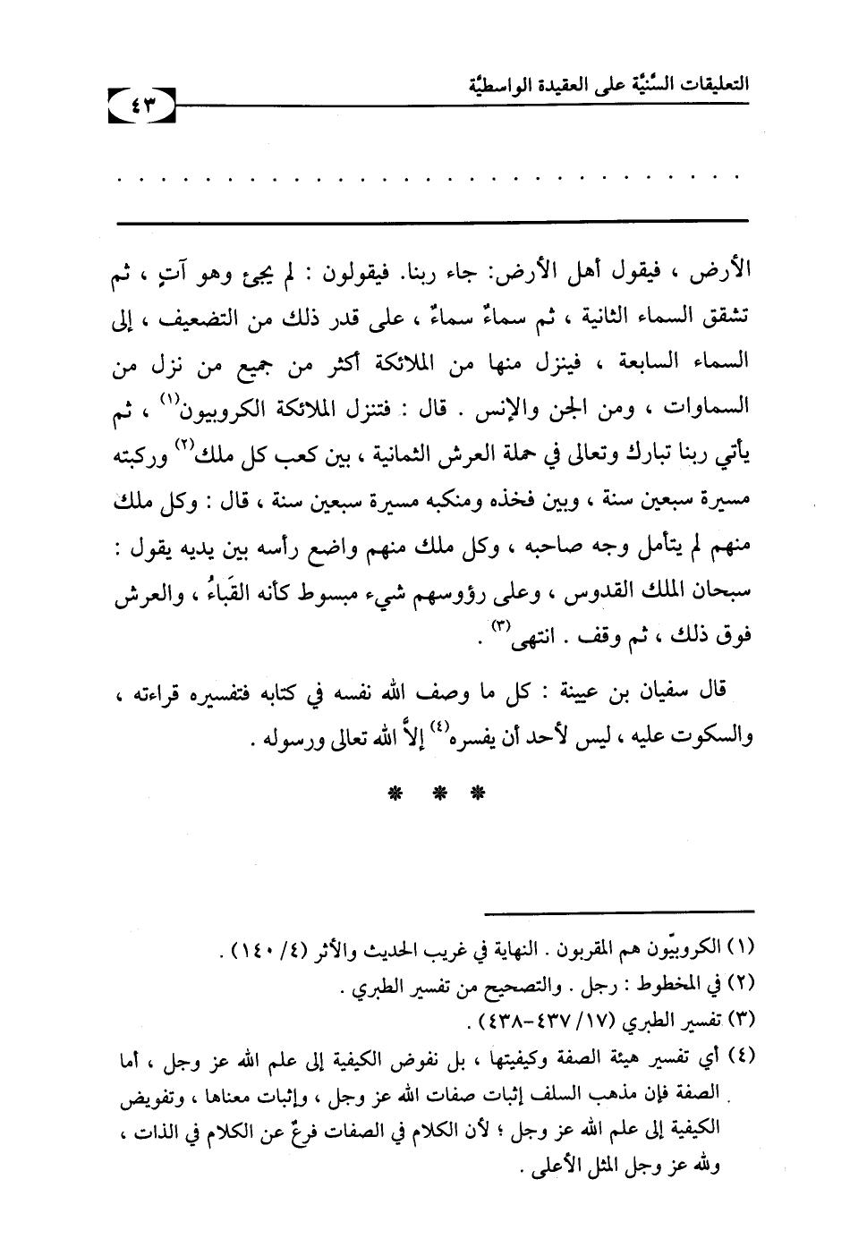 (¬1) أي: تفسير هيئة الصفة وكيفيتها، بل نفوض الكيفية إلى علم الله عز وجل، أمَّا الصفة فإنَّ مذهب السلف إثبات صفات الله عز وجل، وإثبات معناها، وتفويض الكيفية إلى علم الله عز وجل، لأن الكلام في الصفات فرعٌ عن الكلام في الذات، ولله عز وجل المثل الأعلى.