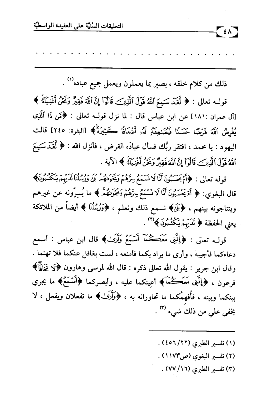 {إِنَّنِي مَعَكُمَا أَسْمَعُ وَأَرَى} [طه: 46] {أَلَمْ يَعْلَمْ بِأَنَّ اللَّهَ يَرَى} [العلق: 14] ، {الَّذِي يَرَاكَ حِينَ تَقُومُ وَتَقَلُّبَكَ فِي السَّاجِدِينَ إِنَّهُ هُوَ السَّمِيعُ الْعَلِيمُ} [الشعراء: 217: 219]